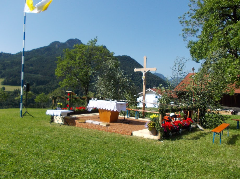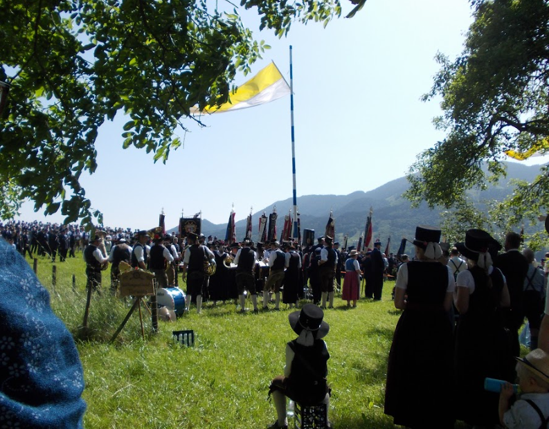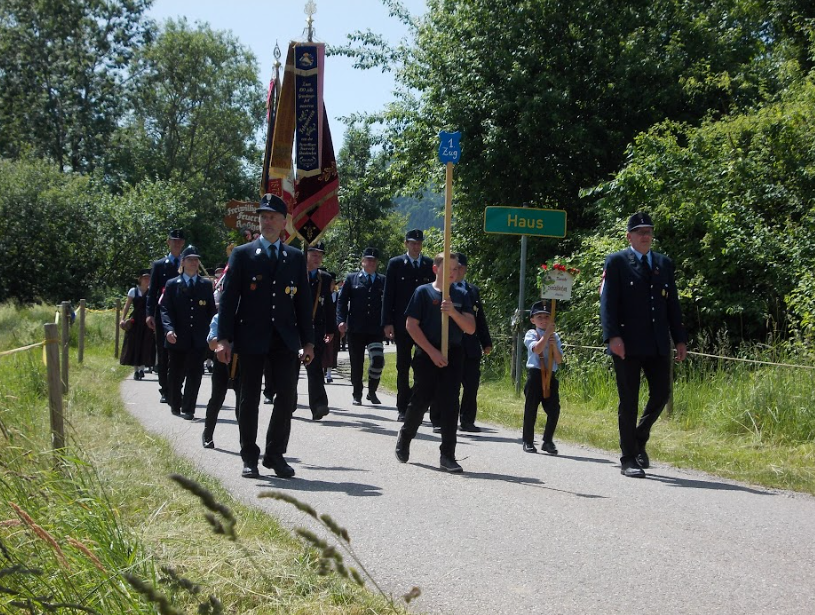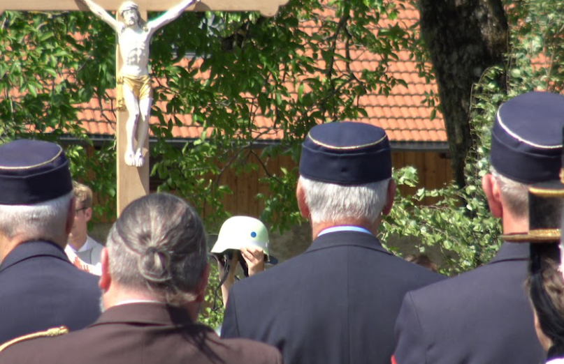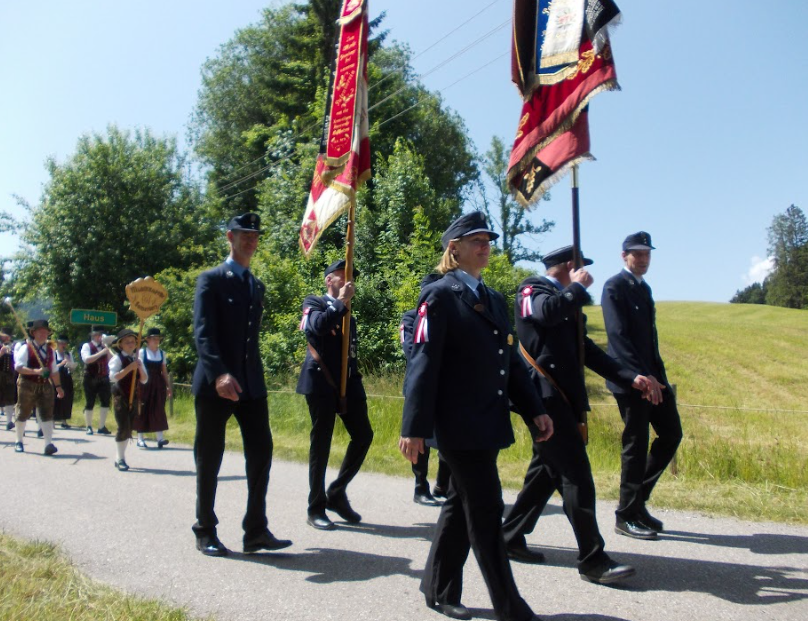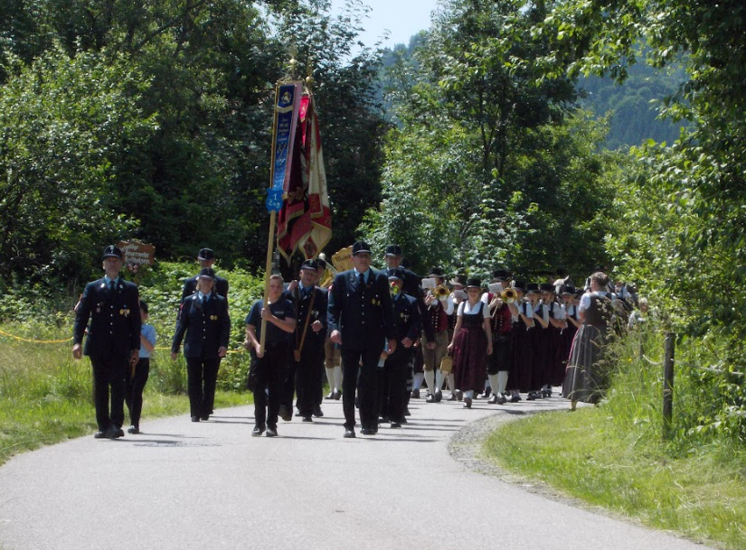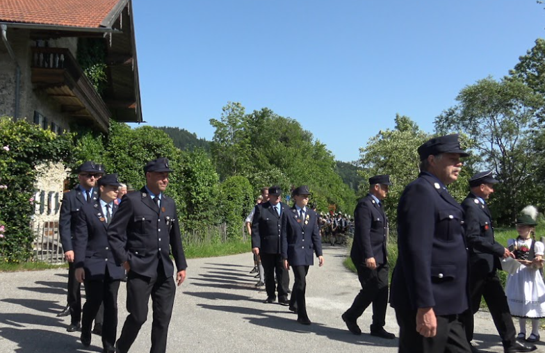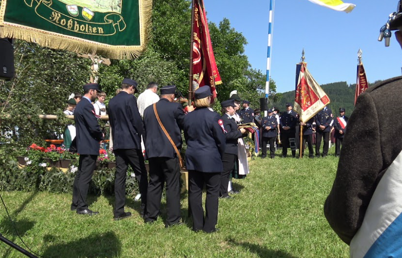 Höhepunkt des Festwochenendes war der feierliche Kirchenzug, der durch den Samerberger Ortsteil Haus führte. Dort fand in Postkartenidyll der feierliche Festgottesdienst statt. Dabei wurden auch die neuen Fahnenbänder gesegnet – je eines für die Feuerwehr Roßholzen und eines für die Feuerwehr Steinkirchen.