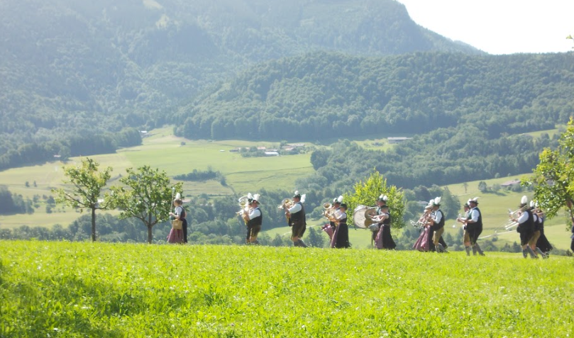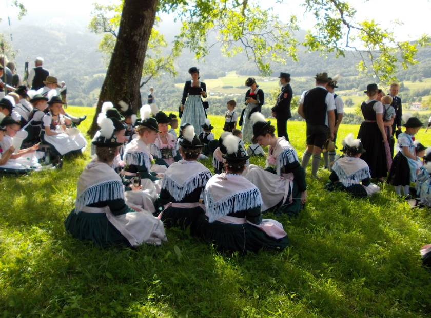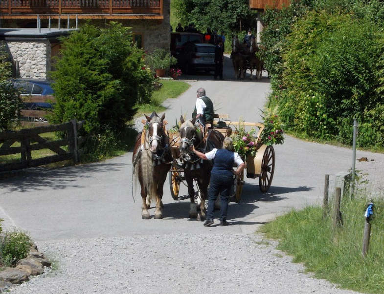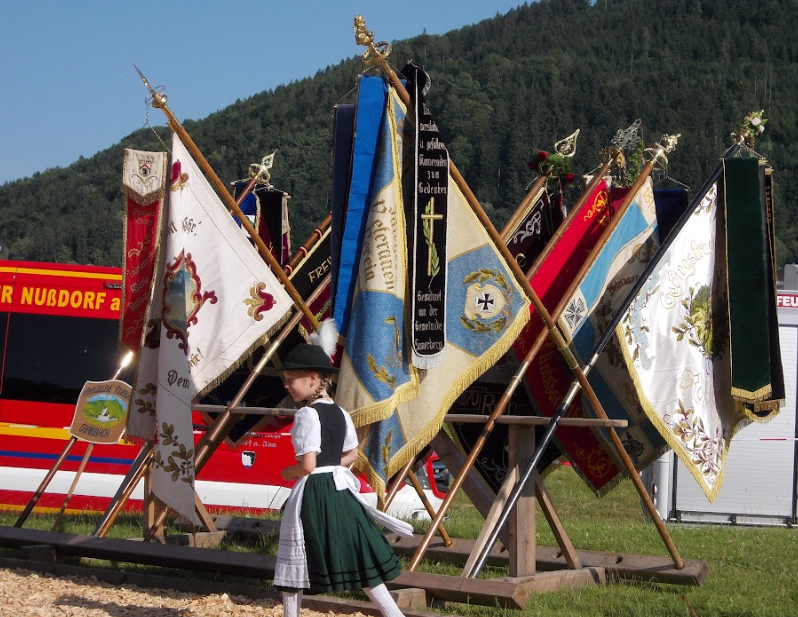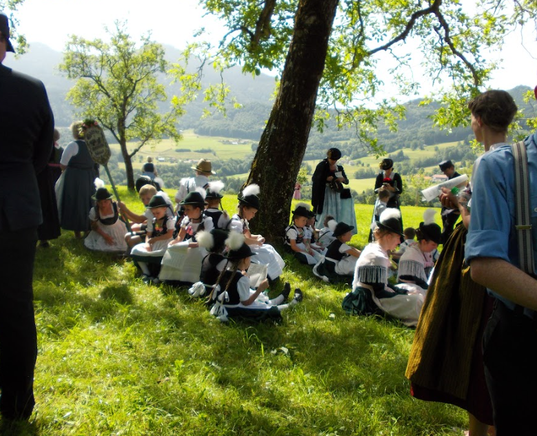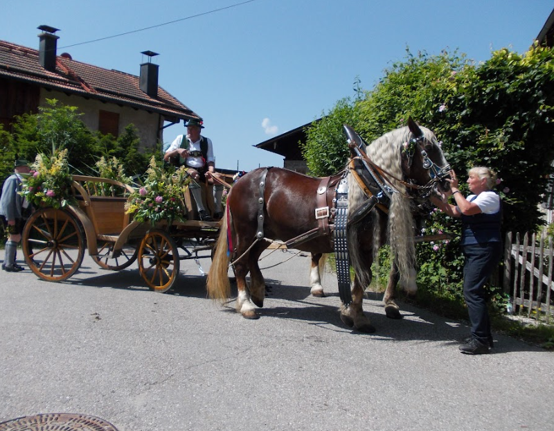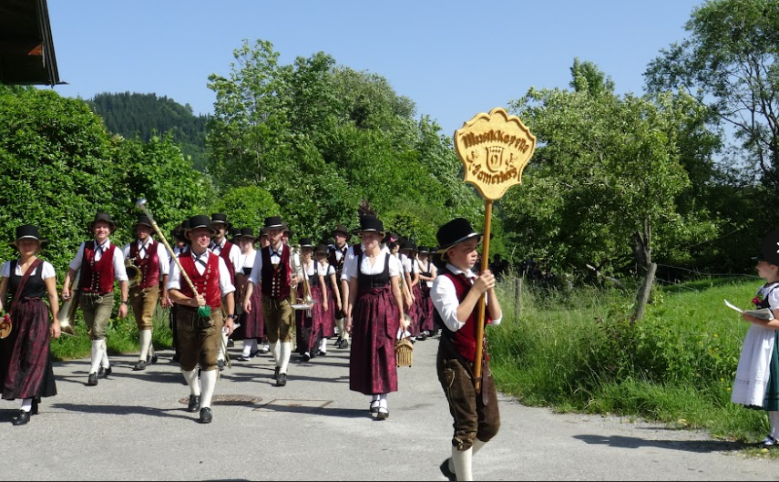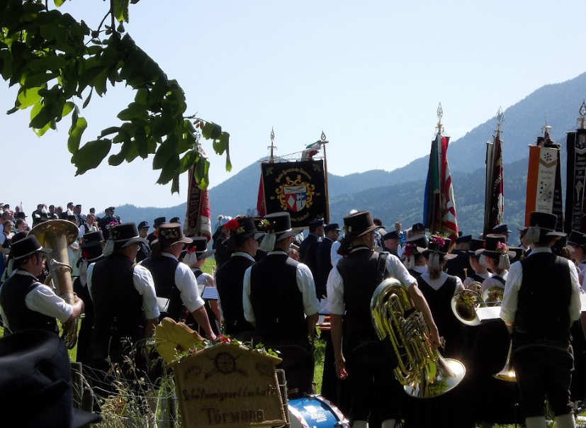 Höhepunkt des Festwochenendes war der feierliche Kirchenzug, der durch den Samerberger Ortsteil Haus führte. Dort fand in Postkartenidyll der feierliche Festgottesdienst statt. Dabei wurden auch die neuen Fahnenbänder gesegnet – je eines für die Feuerwehr Roßholzen und eines für die Feuerwehr Steinkirchen.