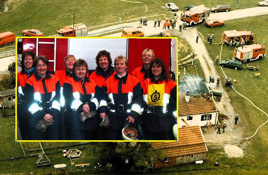 Ein dramatischer Brand im Ortsteil Esbach im Jahr 1995 Hintergrund war der Auslöser dafür, dass sich die Frauenlöschgruppe Törring gründete. Foto: Hintergrund: Archiv Feuerwehr Törring. Damen: Kreisfeuerwehrverband Traunstein