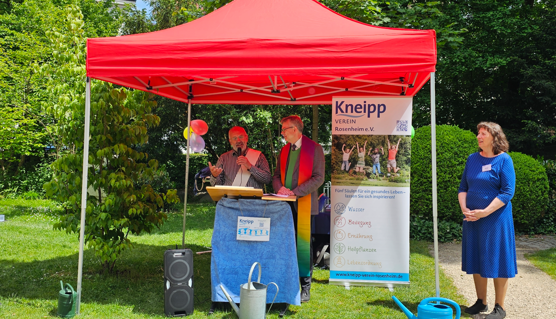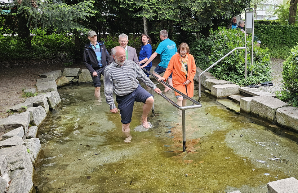 Gerade mal 8 Grad kühl war das Wasser im Kneipp-Becken im Rosenheimer Riedergarten bei der Geburtstagsfeier. Viele Gäste, darunter auch Rosenheims Dritte Bürgermeisterin Gabriele Leicht, der evangelische Pfarrer Dr. Bernd Rother und der katholische Diakon Erwin Brader, hielt dies aber nicht davon ab, sich ihrer Schuhe zu entledigen, die Hosen hochzukrempeln und im bekannten Storchengang durch das Nass zu waten (unser Beitragsbild).