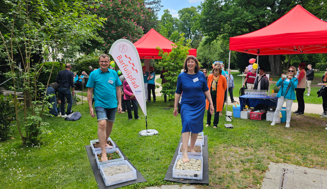Rosenheim – Im Storchengang durchs erfrischende Nass: seit 30 Jahren gibt es die Kneipp-Anlage im Rosenheimer Riedergarten. Gefeiert wurde der runde Geburtstag mit Ankneippen, Sektempfang und der Einweihung eines mobilen Barfußpfades.