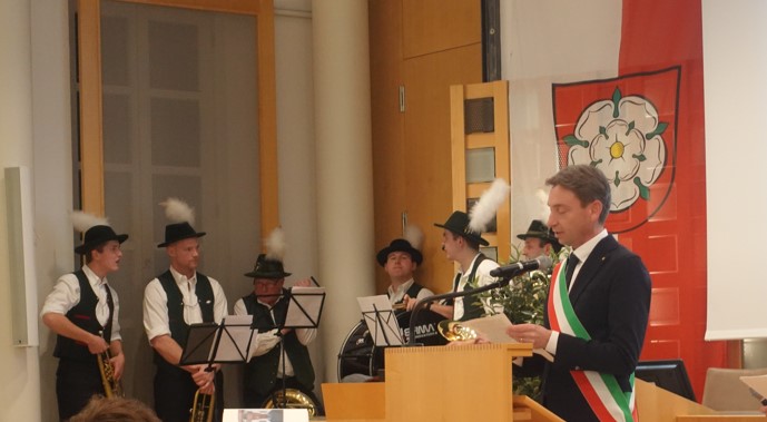 Der Bürgermeister von Lazise durfte sich dann auch noch in das Goldene Buch der Stadt Rosenheim eintragen. Danach verlagerten sich die Feierlichkeiten in die Veranstaltungsräume „Franz im Wiesntor“ bei der Loretowiese. Den Weg dorthin legten die Gäste aus Rosenheim und Lazise gemeinsam zu Fuß zurück, angeführt von Musik und einer Polizeieskorte.