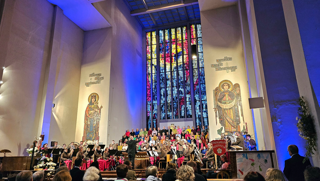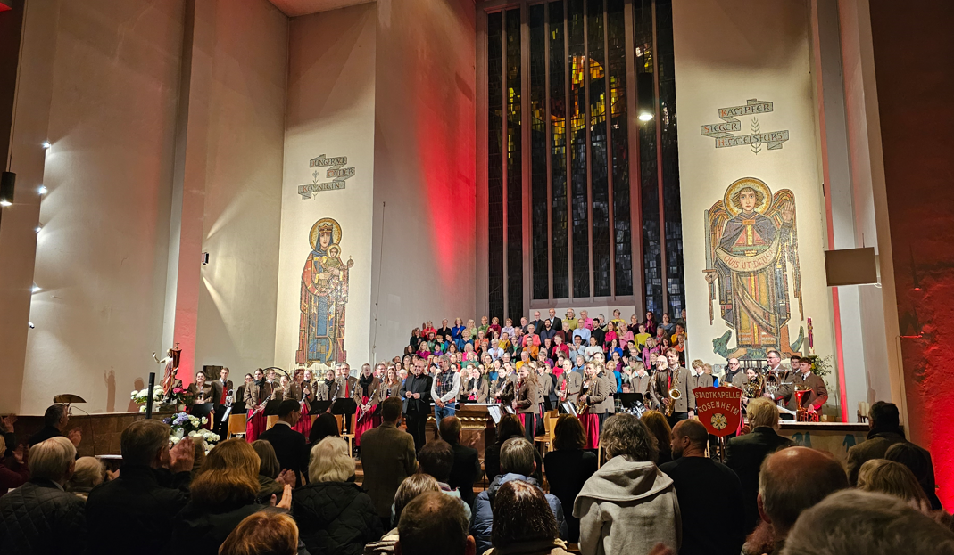 Im Mittelpunkt der Veranstaltung stand aber die Musik, für die sich gut 180 Musiker und Sänger unter der Leitung von Peter Weber und Andreas Penninger zusammengeschlossen hatten und mal mit leisen und dann auch wieder mit kraftvollen Tönen ein starkes Zeichen für Erinnerung, Versöhnung und Frieden setzten. Auf dem Programm standen Werke von Aaron Copland, Carl Jenkins, John Lennon, Felix-Mendelssohn-Bartholdy , Eric Whitacre und Mark Steigerwald.
