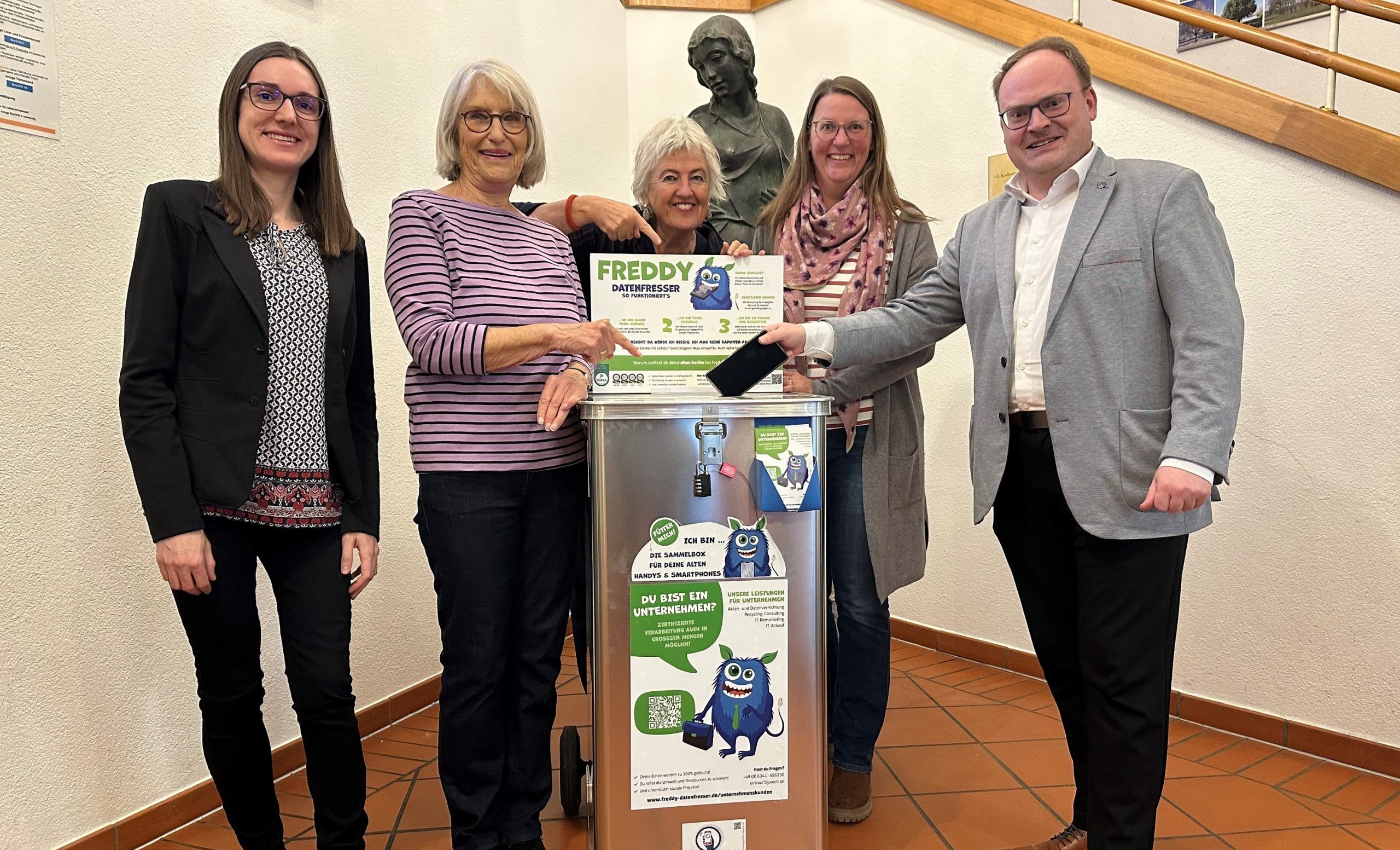 (Quelle: Pressemitteilung Markt Prien am Chiemsee / Beitragsbild: Im Eingangsbereich des Rathauses ist das Priener Sammelzentrum der „HandyAktion Bayern“. (v.l.n.r.) Die Büchereileiterin Melanie Schieber, die Fairtrade-Beauftragte und Gemeinderätin Angela Kind, die Inhaberin des Eine-Welt-Ladens Monica Lieschke, die Fairtrade-Beauftragte und Projektkoordinatorin Bettina Bartsch und der Erste Bürgermeister der Marktgemeinde Andreas Friedrich füttern die Freddy-Alu-Sammelbox mit ihren Althandys. Copyright Markt Prien a. Chiemsee)