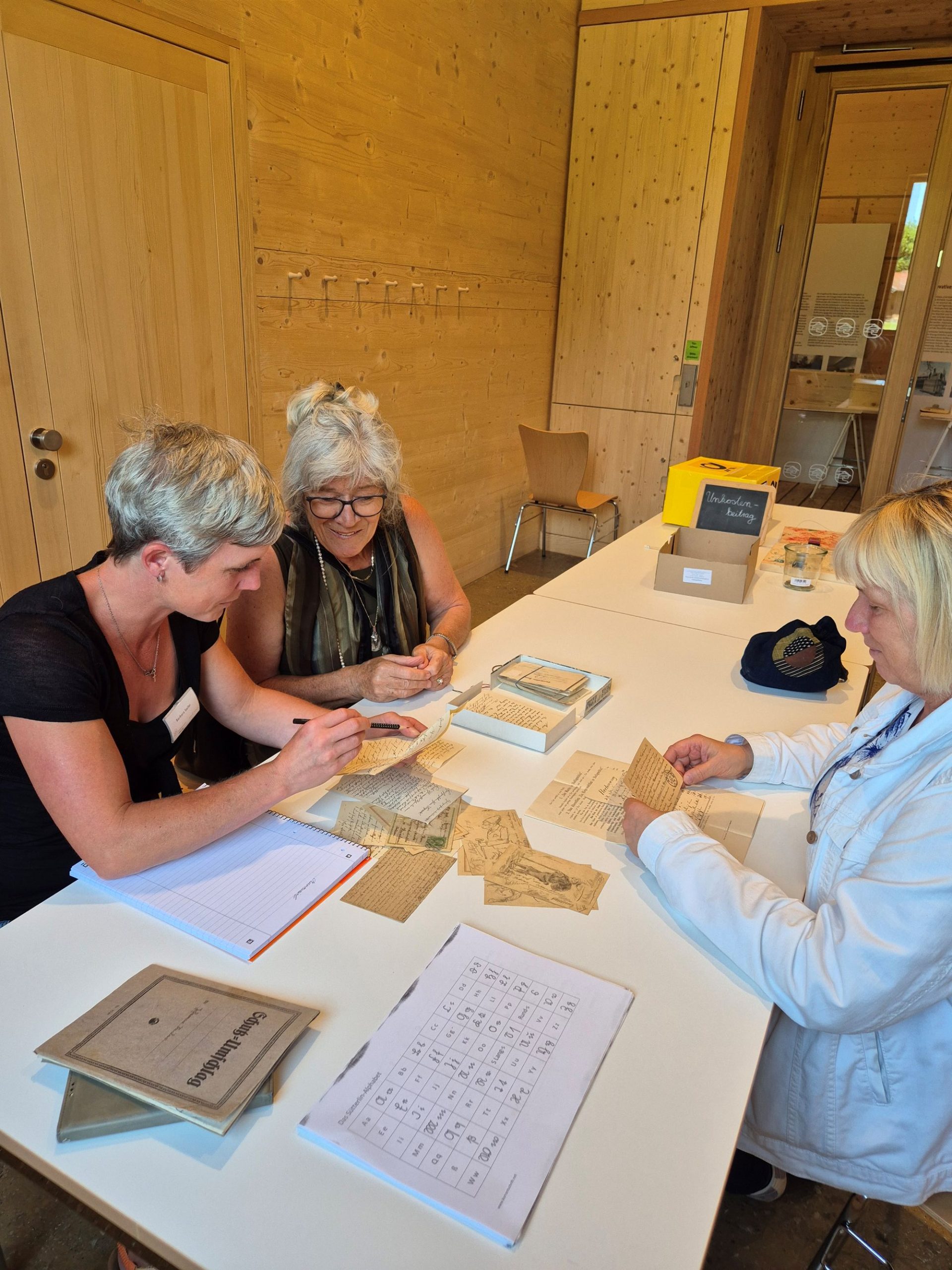 Barbara Sailer, Karin Silmbrod und Renate Engelhardt beim Entziffern von Briefen in der Sütterlin-Schrift (von links nach rechts). Foto: Copyright Bezirk Oberbayern, FLM Amerang
