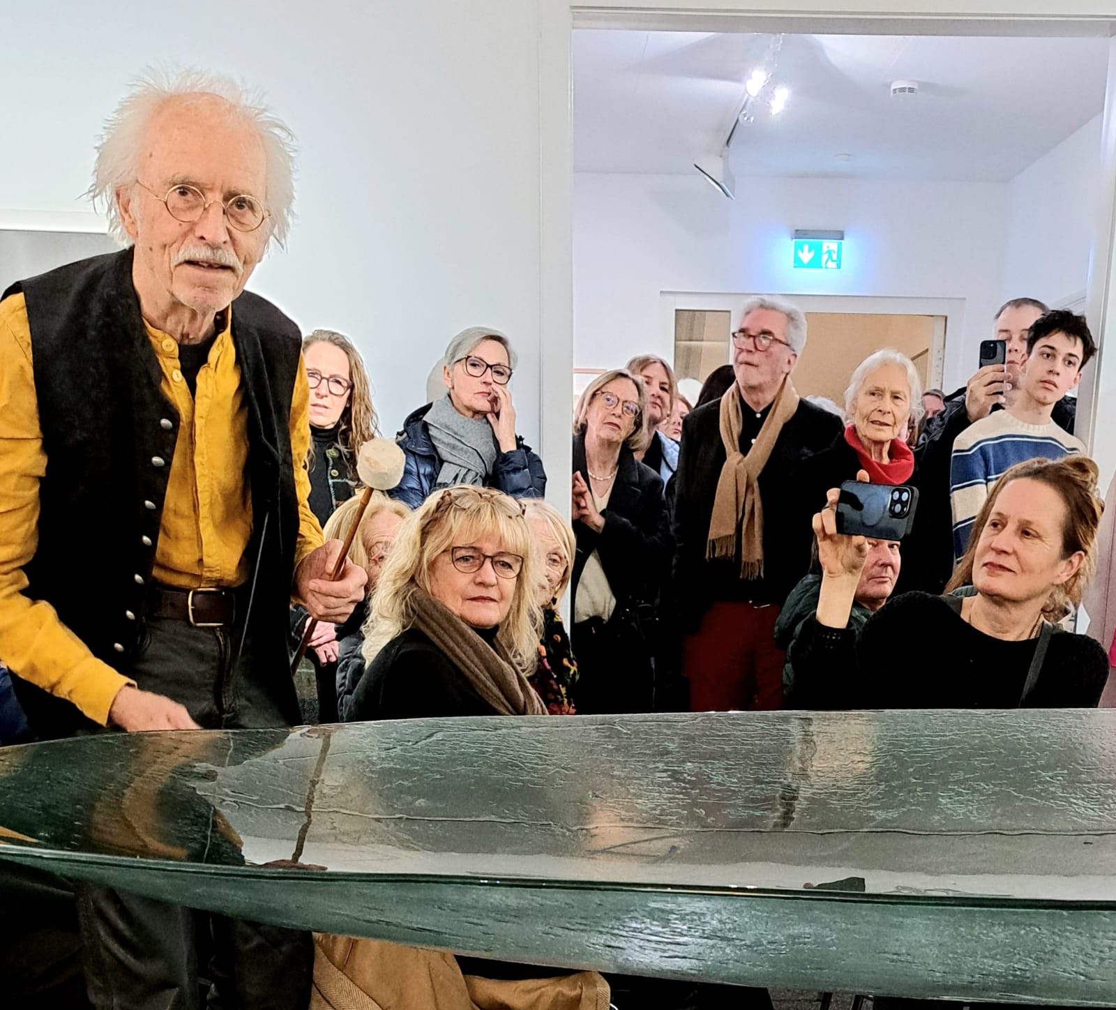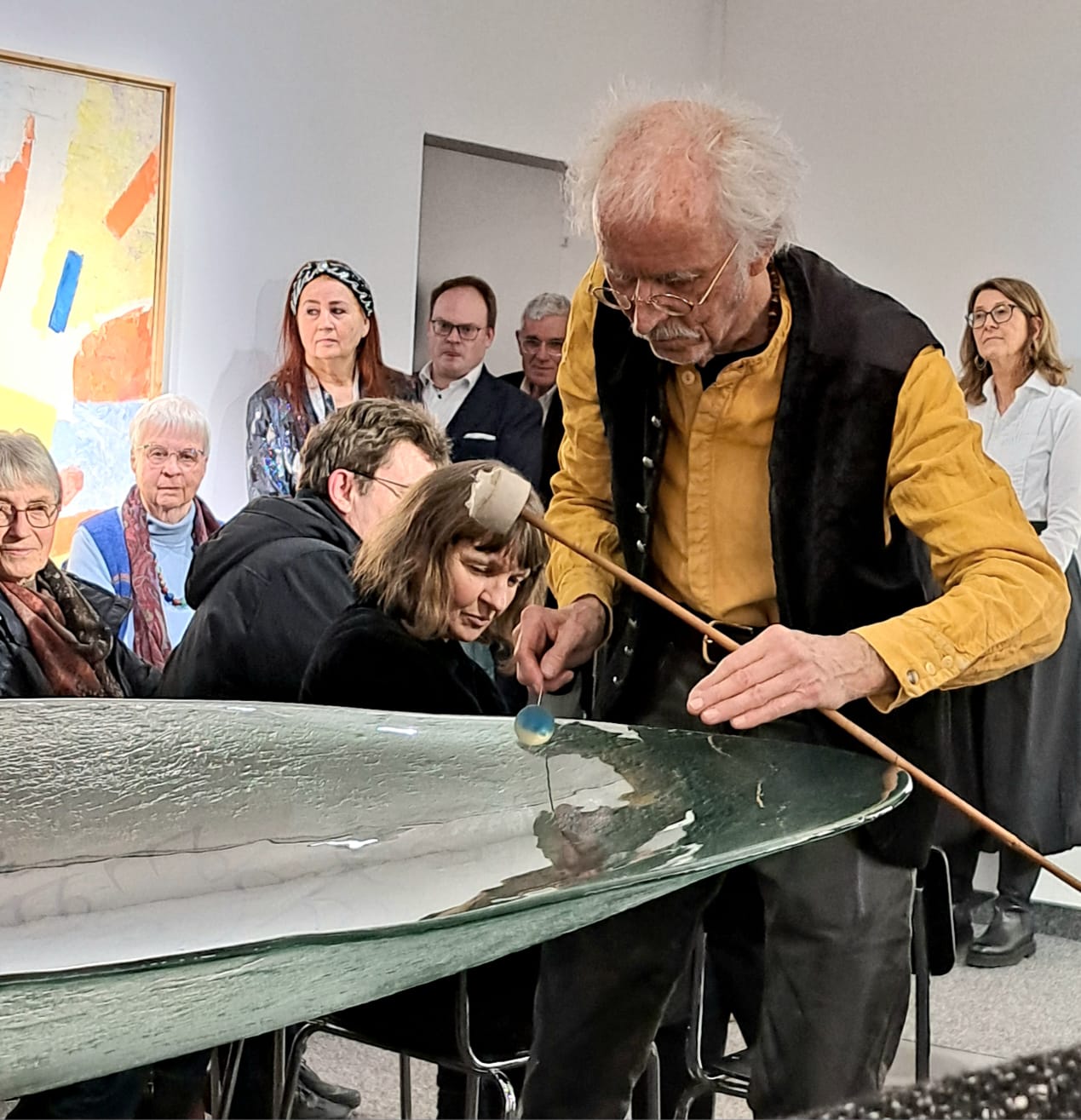 Die Vernissage am Freitagabend (28.2.2025) war gut besucht. Glaskünstler und Musiker Florian Lechner erzeugte dabei auf einer seiner großen Glasschalen rhythmische Töne. Außer seiner Familie waren auch die Schwiegertochter und der Enkel des 1999 verstorbenen Malers Fritz Harnest aus Übersee anwesend, denn auch sein künstlerisches Schaffen wird mit dieser Ausstellung ins Rampenlicht gerückt.