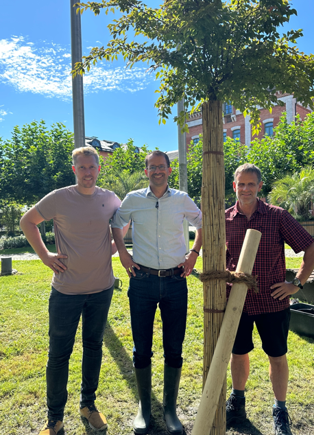 Baum-Pflanz-Challenge erfolgreich erfüllt: Rosenheims Oberbürgermeister Andreas März hat die März-Kirsche zusammen mit den beiden Stadtgärtnern Peter Gabler und Andreas Heinzlmeir in der Wiese vor dem Rosenheimer Rathaus gepflanzt. Foto: Copyright Stadt Rosenheim