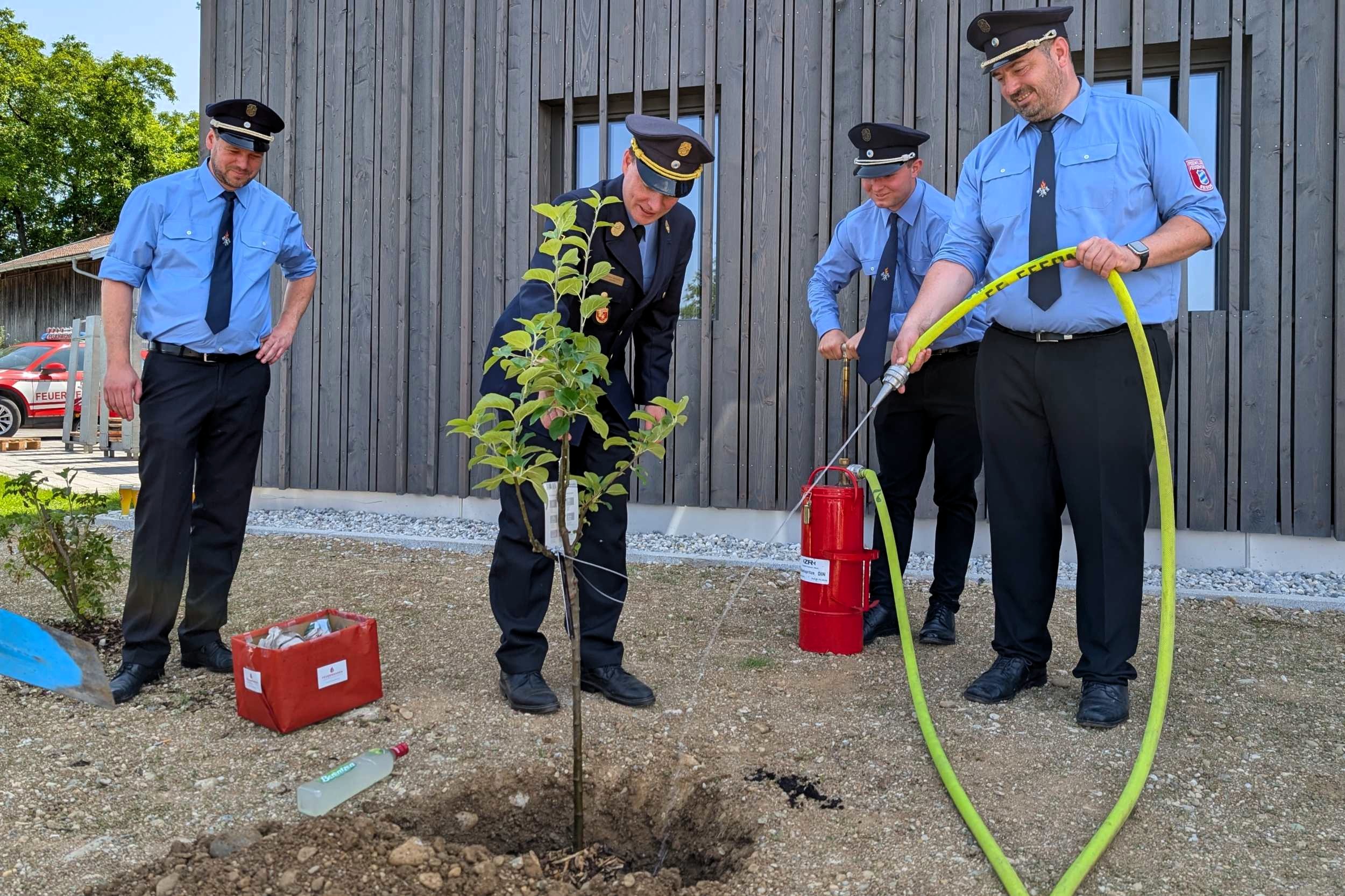 Die offizielle Übergabefeier des neuen Gerätehauses in Seeon kam da gerade recht. Die Vertreter der Kreisfeuerwehrverbandes hatten für die Außenanlage als Gastgeschenk einen Apfelbaum besorgt, der im Anschluss an den Festakt direkt durch die Verbandsvertreter gepflanzt wurde. Die drei Kommandanten Stefan Anderl, Franz Parzinger und Vincent Pape haben die Aktion an der Kübelspritze zur ersten Bewässerung „standesgemäß“ begleitet.
