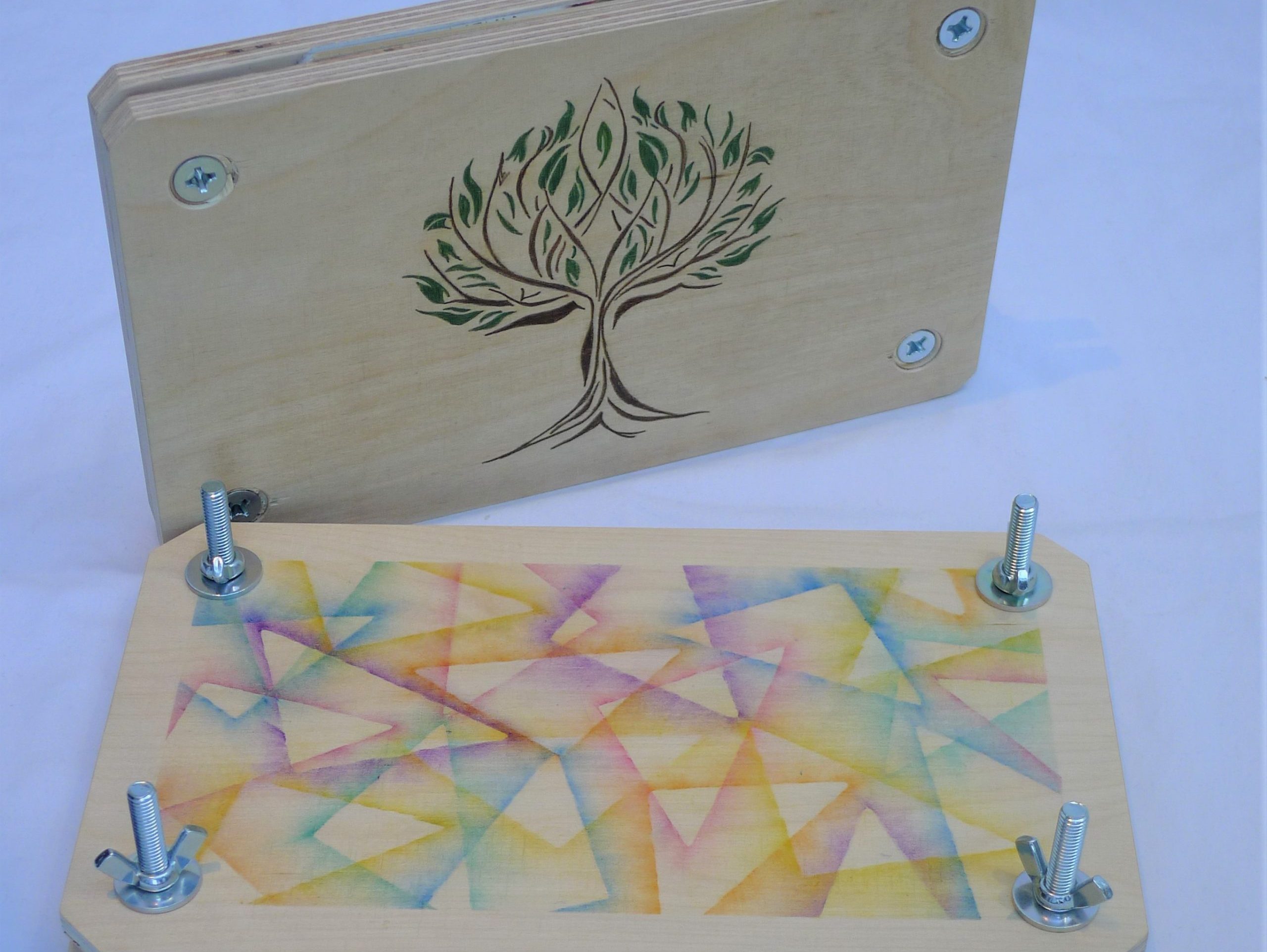 Die Fläche zum Gestalten auf der presse bietet Platz für fantasievolle Designs. Zur Verfügung stehen Buntstifte, Wachsmalkreiden und Seccorell-Farben. Wer möchte, darf auch eigene Gestaltungsvorlagen mitbringen, um der persönlichen Blumenpresse eine noch individuellere Note zu verleihen.