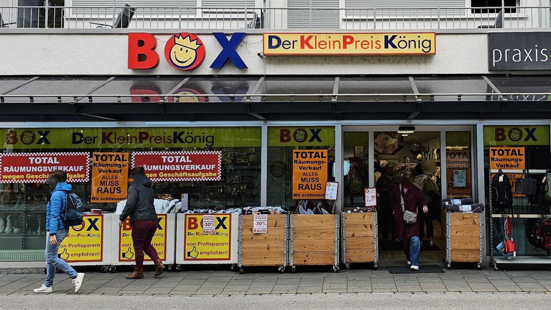 Die Filiale von BOX – Der KleinPreisKönig in der Heilig-Geist-Straße in Rosenheim wird geschlossen. Der Räumungsverkauf läuft noch bis Dezember 2025.