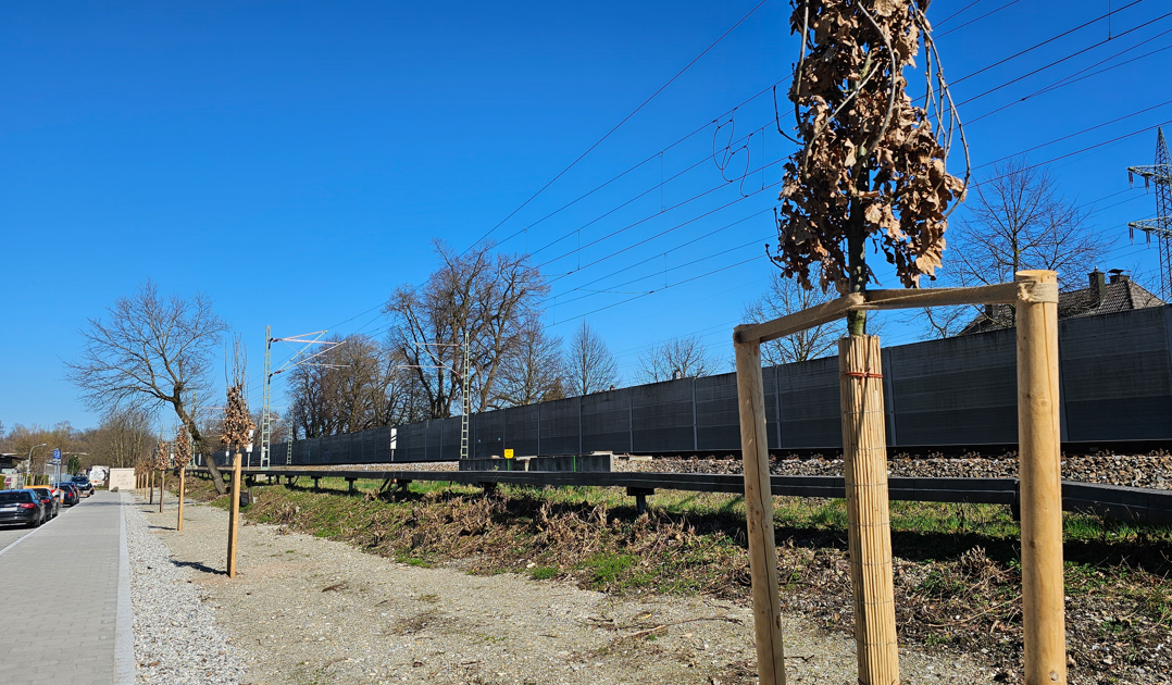 Bis jetzt wurde der unbefestigte Streifen zwischen Bahngleis und Fuß- und Radweg in der Rosenheimer Brückenstraße gerne von Autofahrern zum Parken genutzt. Jetzt wurden dort Bäume gepflanzt. Foto: Innpuls.me