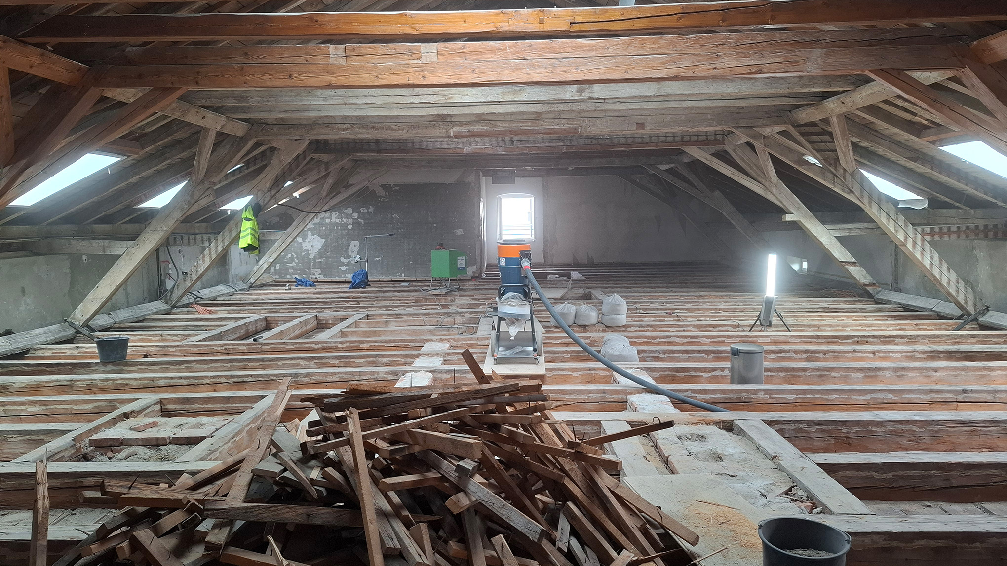 In einem ersten Schritt wurde der Dachraum vollständig freigelegt: Deckenverkleidungen, Zwischenwände und Bodenaufbauten wurden entfernt. Danach ist die Ertüchtigung der Deckenbalken vorgesehen. Das Tragwerk des Daches ist durch eine Vielzahl an Eingriffen über die Jahrzehnte stark in Mitleidenschaft gezogen worden; auch hier sind deshalb umfangreiche statische Maßnahmen erforderlich, um das ursprüngliche Tragwerk wiederherzustellen.