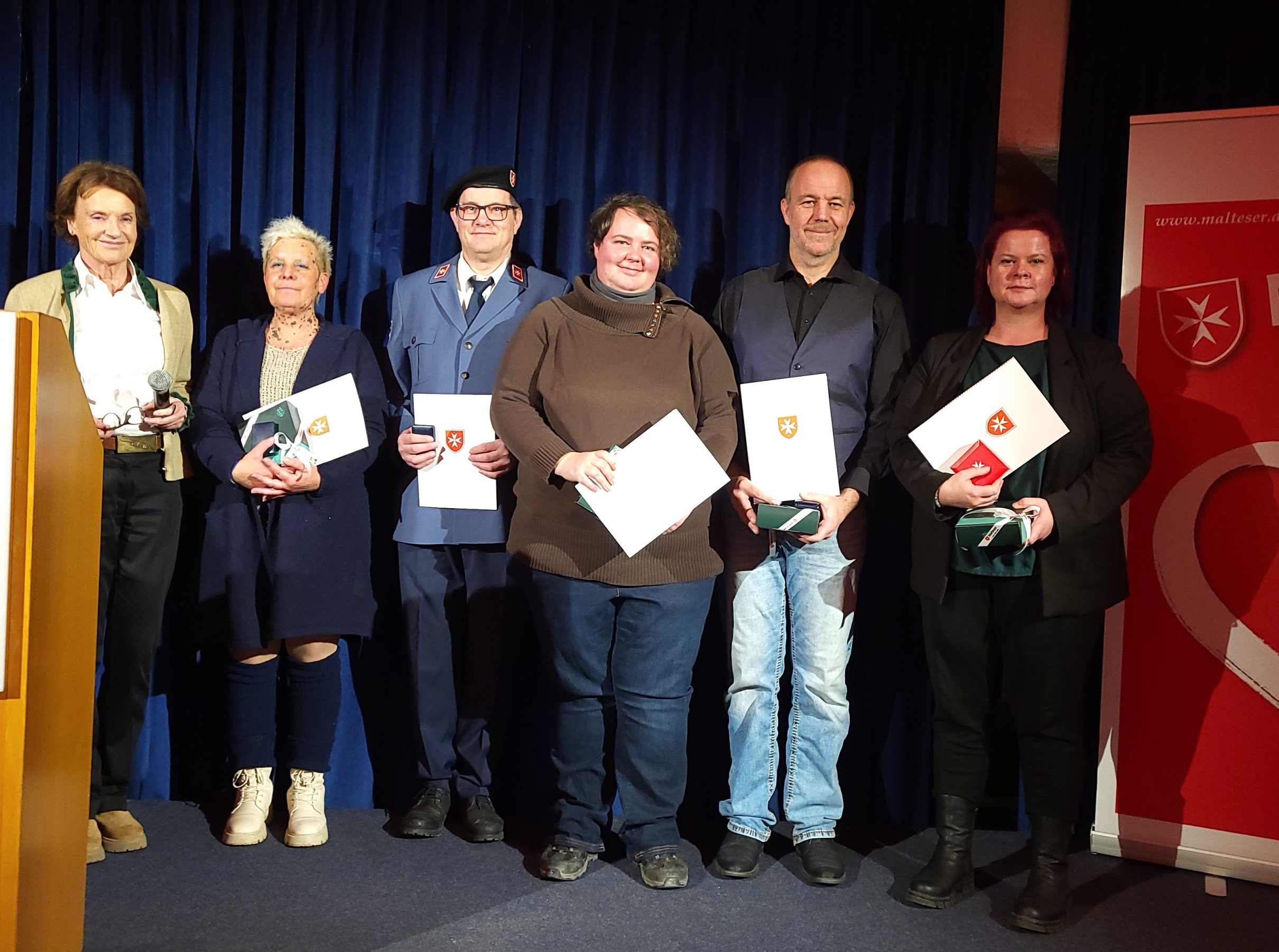 von links: Stephanie Freifrau von Freyberg, ehrenamtliche Stadt- und Kreisbeauftragte der Malteser Rosenheim, mit den geehrten Ehrenamtlichen: Sunny Klee, Peter Raab, Carina Jeck, Andreas Lukas und Andrea. Fotos: Malteser