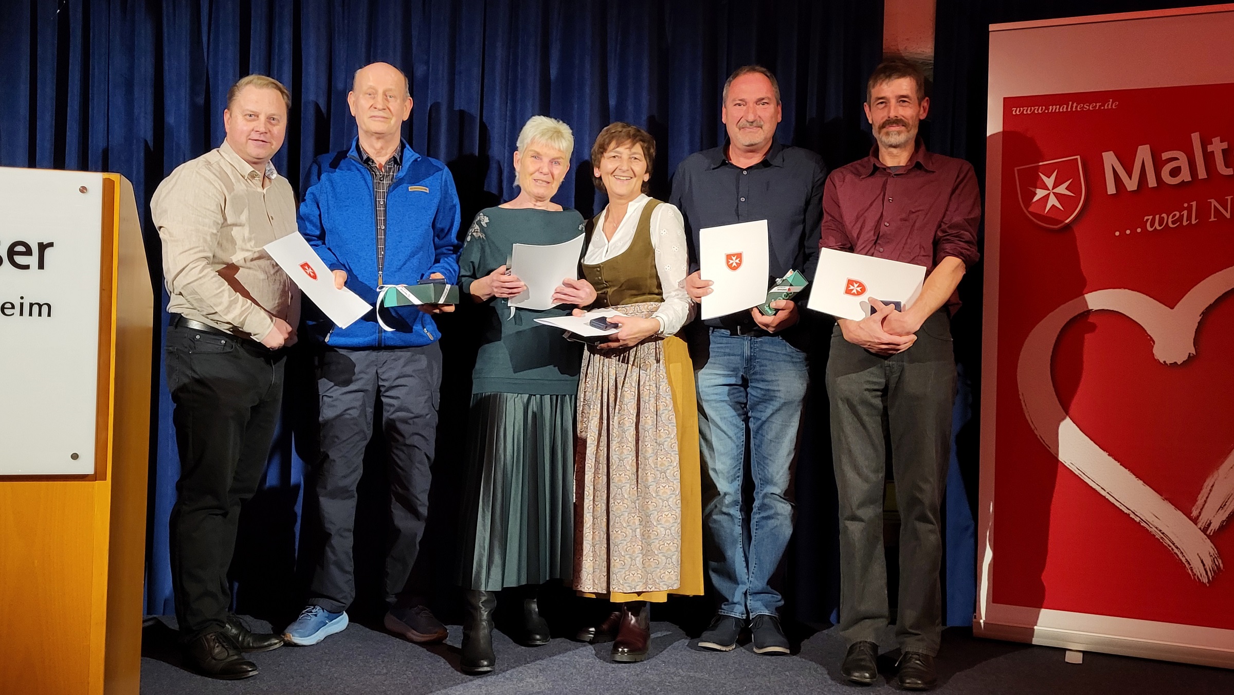 von links: Für 15 oder 10 Jahre treue Mitarbeit im Fahrdienst bedankte sich Ernst Schütz, Stadt- und Kreisgeschäftsführer der Malteser Rosenheim, bei Gerd Peter Müller, Heidi Obendorfer, Marion Hollinger und Artur Nawrotzki. Florian Bauer ist dem Rettungsdienst der Malteser schon seit 25 Jahren treu.