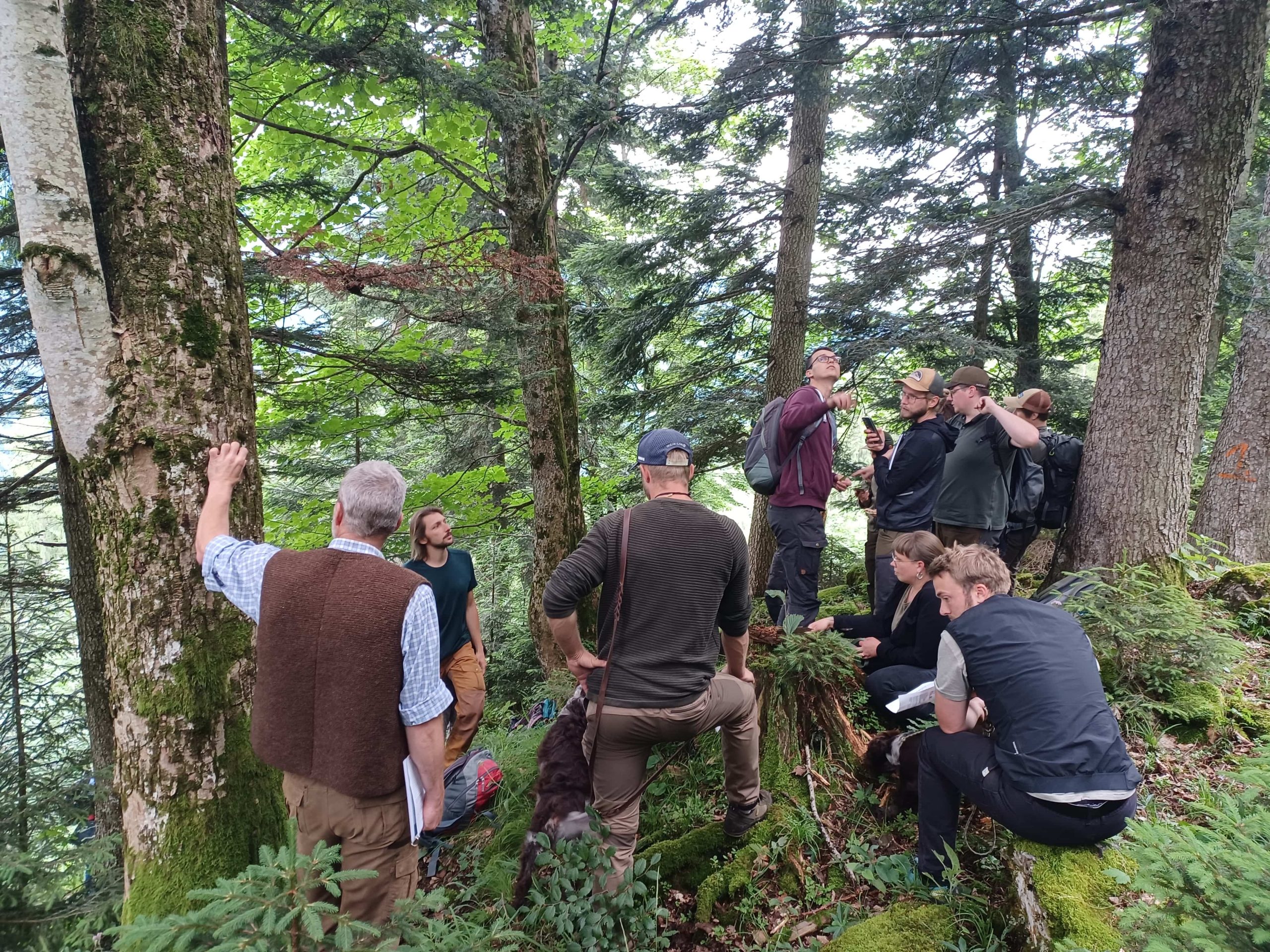 Praktische Übung zur Bestandaufnahme und Nachweissuche im Auerhuhn Lebensraum. Foto: Helena Löffler-LWF