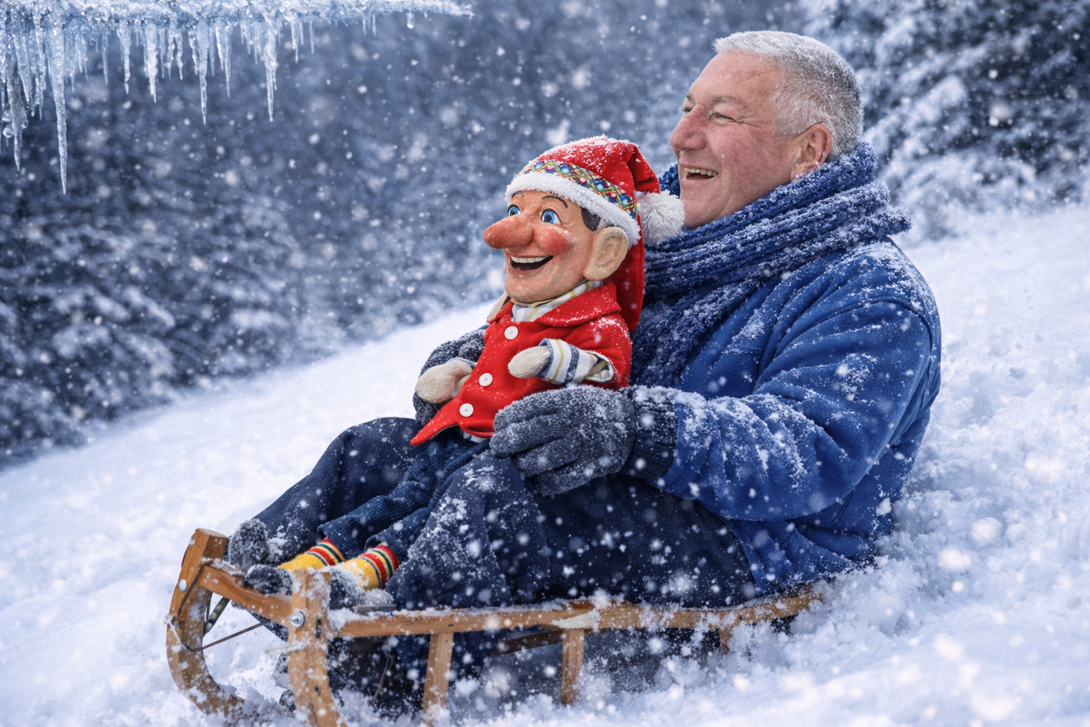 Stephan Mikat auf Schlittenfahrt mit seinem Chiemsee-Kasperl. Foto: Stephan Mikat