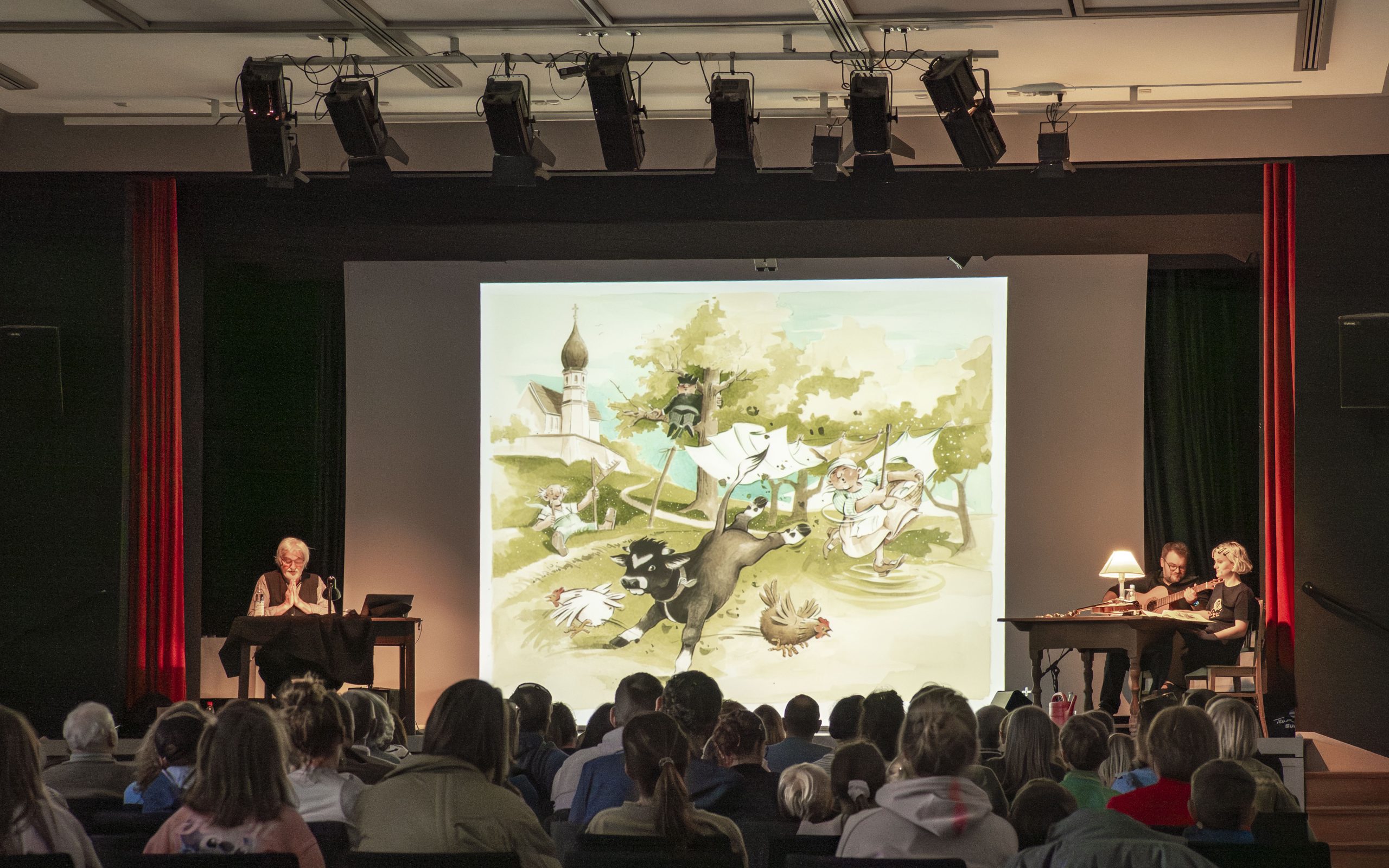 Mehr als 130 Besucherinnen und Besucher verfolgten, wie Huber aus seinem Buch vorlas, während die Illustrationen großflächig auf eine Leinwand projiziert wurden. Musikalisch untermalten der Autor auf der Ziach, Sohn Sebastian auf der Gitarre und Tochter Josephine auf der Geige die Lesung. Mit ihrer Stimme schlüpfte Josephine zudem in verschiedene Rollen und ließ die Figuren lebendig werden.