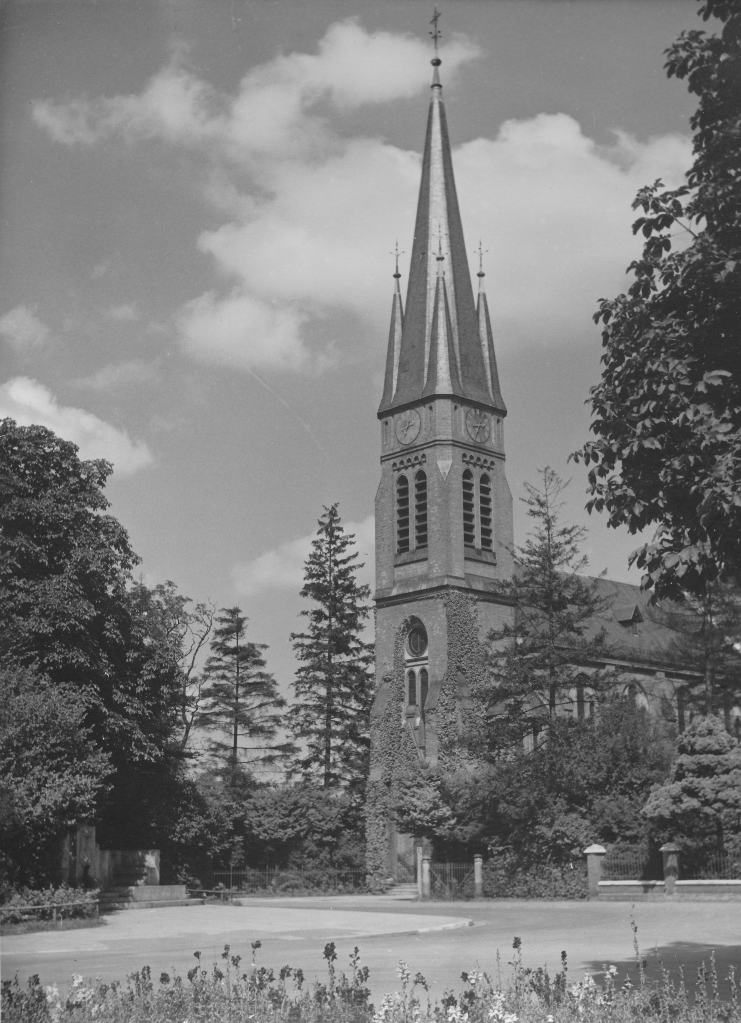 Erbaut wurde die Kirche, nach unseren Recherchen im Internet, in den Jahren 1885 bis 1886 nach den Plänen des Leipziger Architekten August Hartel, der später Dombaumeister in Straßburg wurde. Markenzeichen ist die rote Backsteinfassade im Stil der norddeutschen Backsteingotik. Auffallend ist auf dieser Aufnahme das satte Grün drumherum.