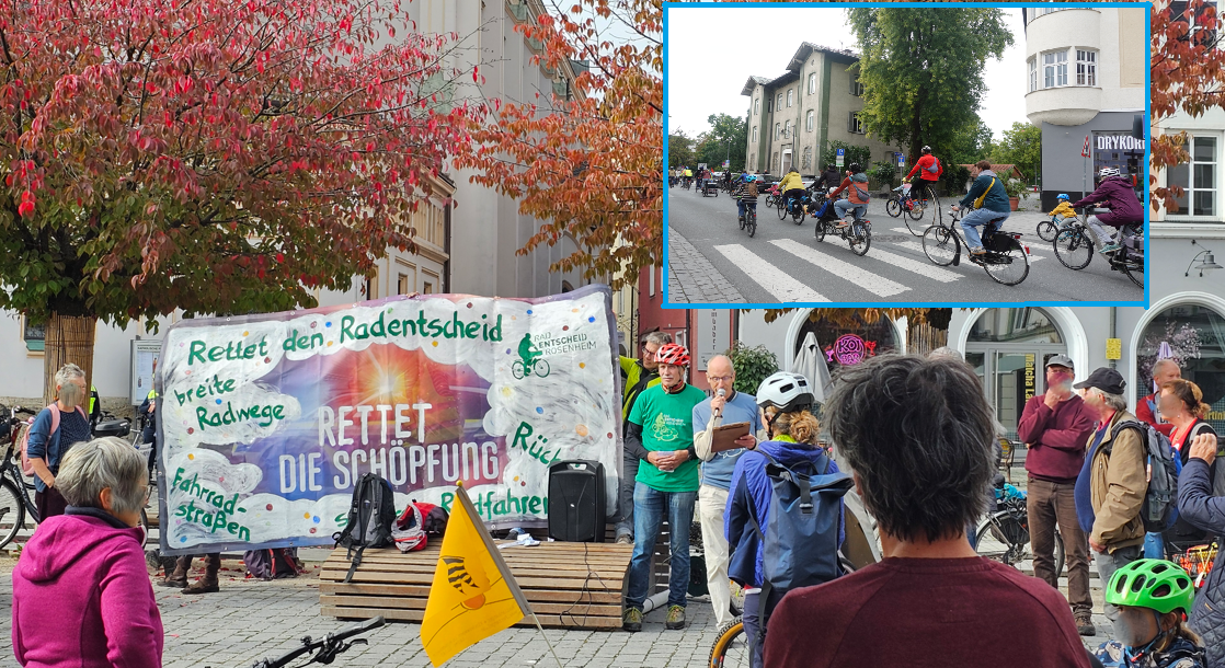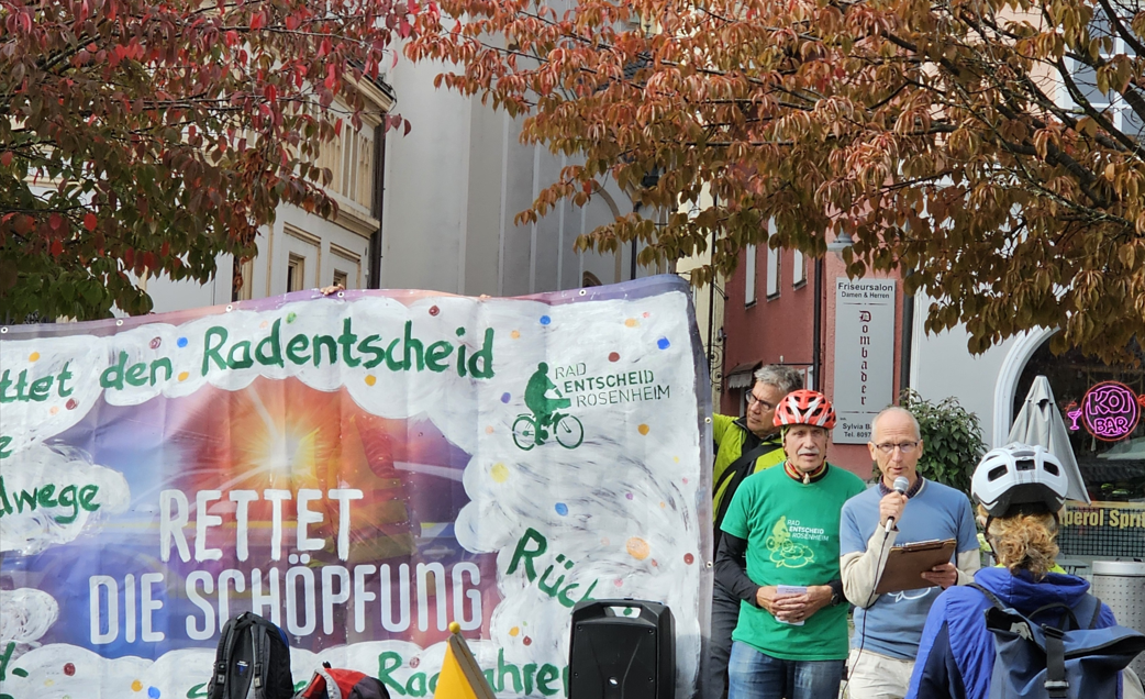Rosenheim – Auf dem Ludwigsplatz in Rosenheim startete am gestrigen Samstag (27.9.2025) eine Fahrraddemo der Initiative Radentscheid. Auf einem Banner war zu lesen: „Rettet den Radentscheid – Rettet die Schöpfung“. Die Initiative weist seit dem Bürgerentscheid von 2020 darauf hin, dass aus ihrer Sicht bisher zu wenig für eine fahrradfreundlichere Stadt umgesetzt wurde.