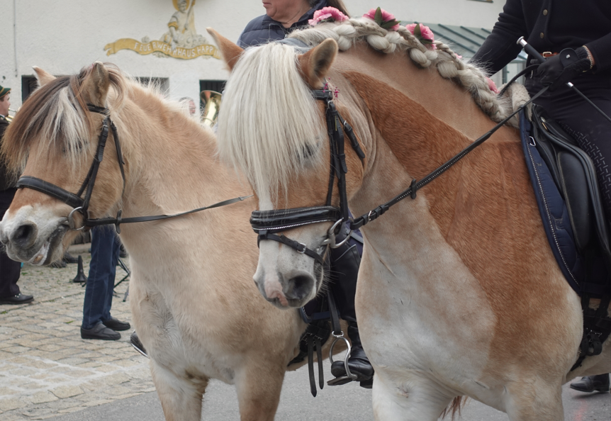 Aus Frasdorf kamen die beiden Kaltblutstuten Steffi und Samanta, festlich gestriegelt und geschmückt. Ihr Besitzer berichtete, dass sie in diesem Jahr noch an mehreren Leonhardiritten in der Region teilnehmen werden. „Der Ritt in Happing gefällt mir besonders gut, weil er kleiner und ruhiger ist. Außerdem ist die enge Strecke eine besondere Herausforderung für mein Gespann“, sagte er.
