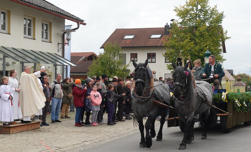Rund 40 festlich geschmückte Pferde und Gespanne nahmen am Sonntag, 12. Oktober, am Leonhardiritt in Happing teil. Bei mildem Herbstwetter startete die traditionelle Brauchtumsveranstaltung mit einem Gottesdienst auf dem Dorfplatz – und endete mit dem kirchlichen Segen für Ross und Reiter.