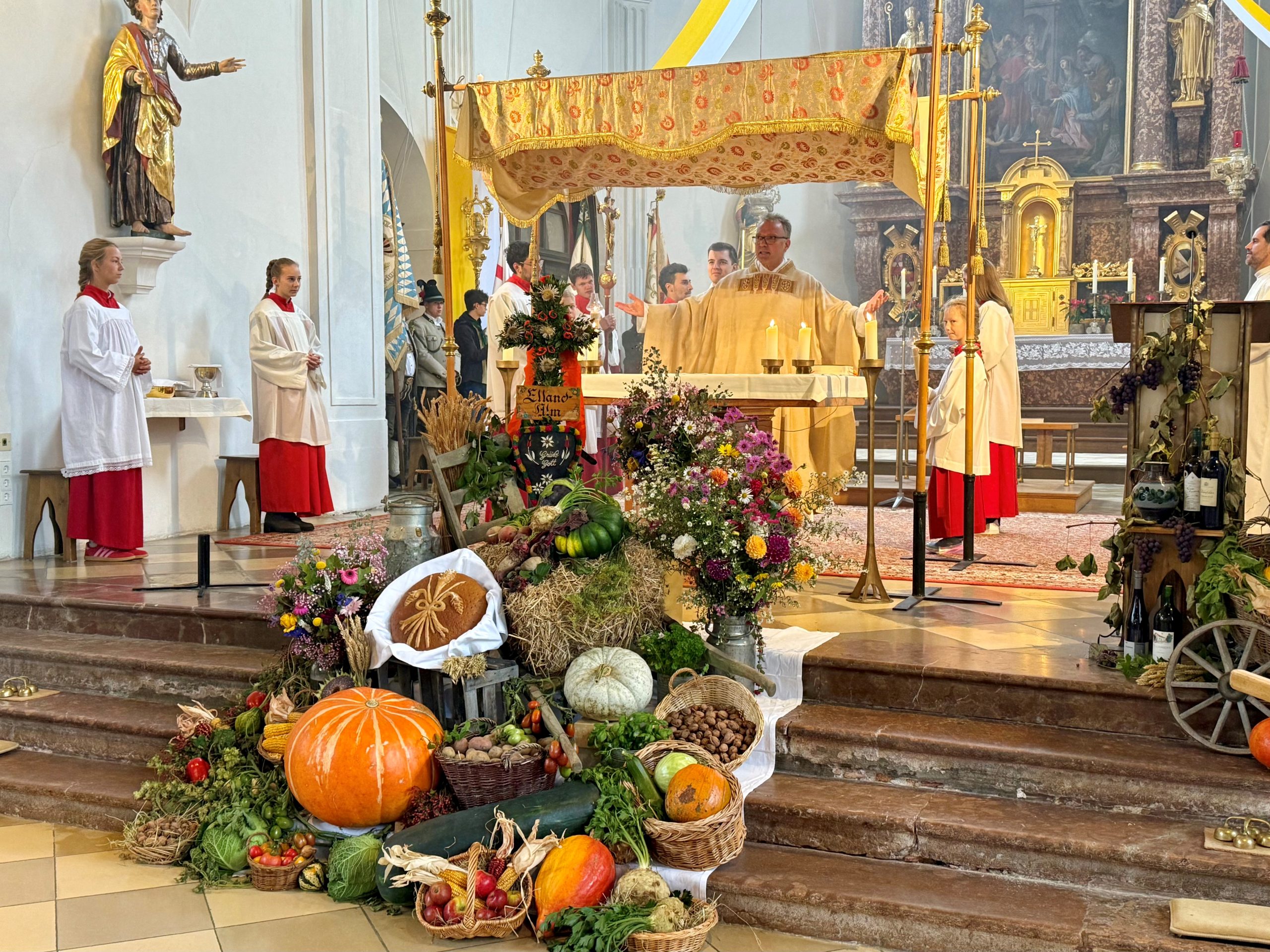 Der Altarraum wurde durch das Standbild der Heiligen Notburga, eine große Erntekrone aus vier verschiedenen Getreidesorten sowie durch Gemüse, Blumen und Früchte besonders eindrucksvoll in Szene gesetzt.