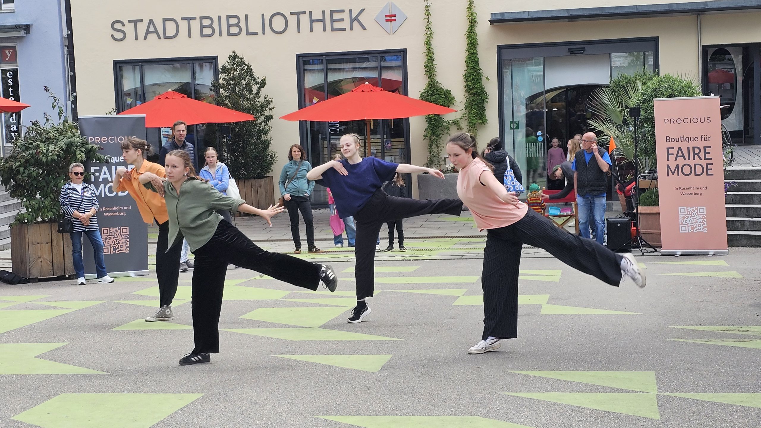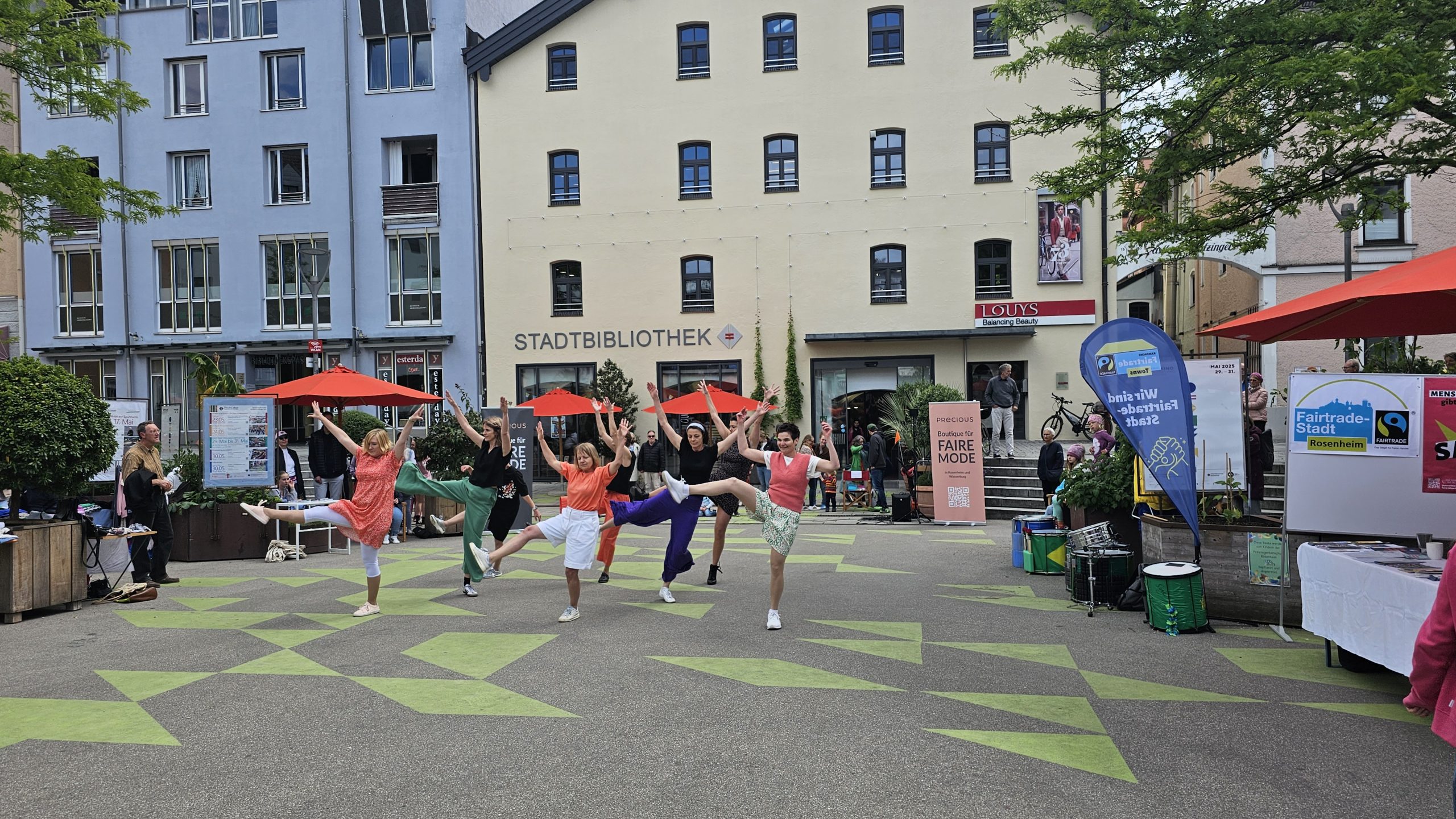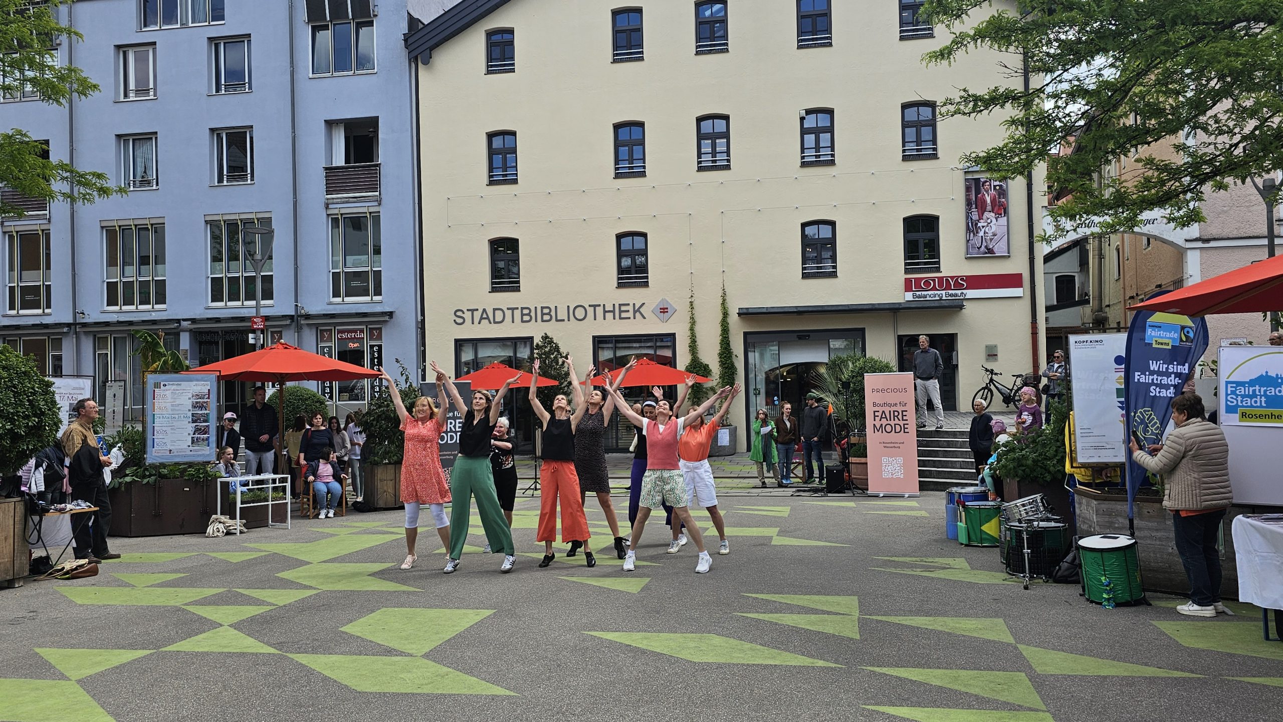 Rosenheim – Mit einer getanzten Modenschau wurde am gestrigen Samstagvormittag (24.5.2025) am Salzstadel in Rosenheim auf fair hergestellte Kleidung aufmerksam gemacht. Außerdem gab es für die Besucher einen kleinen Floh- und Verschenkmarkt sowie Infos rund um fairen Handel.