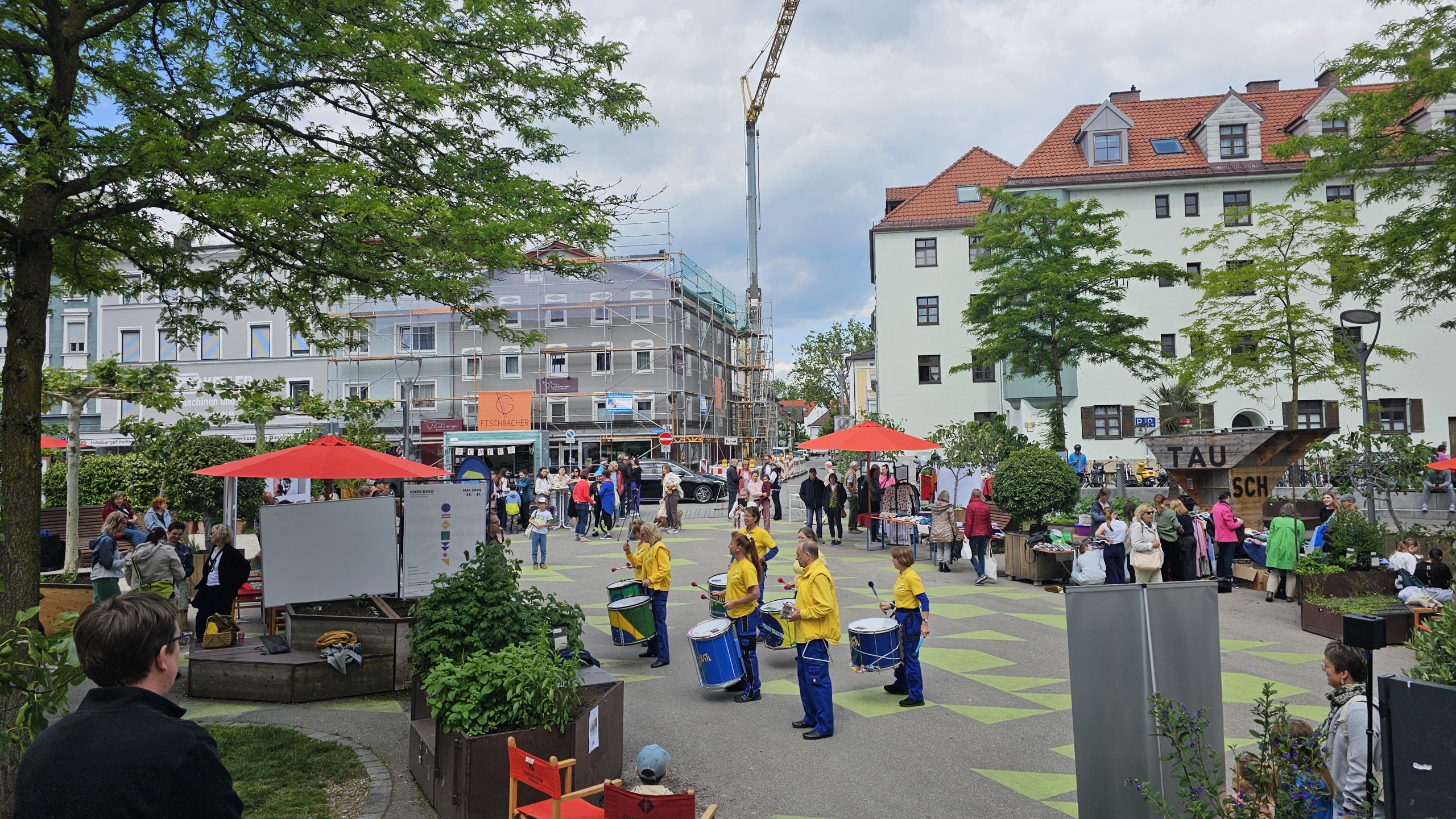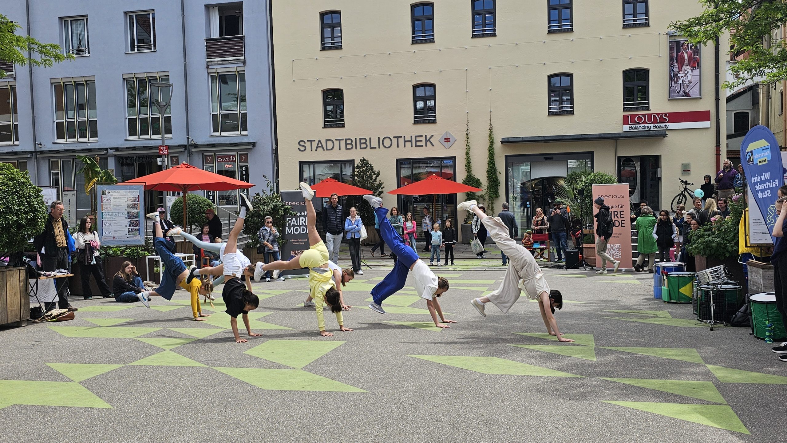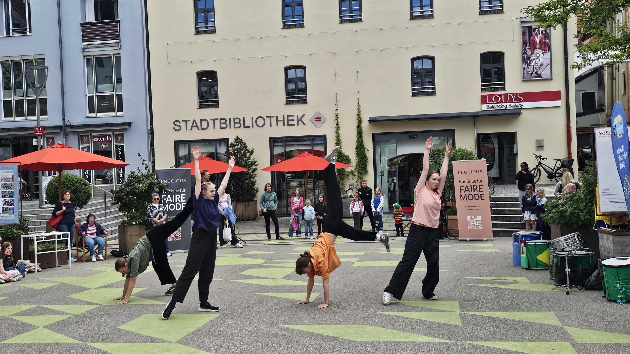 Rosenheim – Mit einer getanzten Modenschau wurde am gestrigen Samstagvormittag (24.5.2025) am Salzstadel in Rosenheim auf fair hergestellte Kleidung aufmerksam gemacht. Außerdem gab es für die Besucher einen kleinen Floh- und Verschenkmarkt sowie Infos rund um fairen Handel.