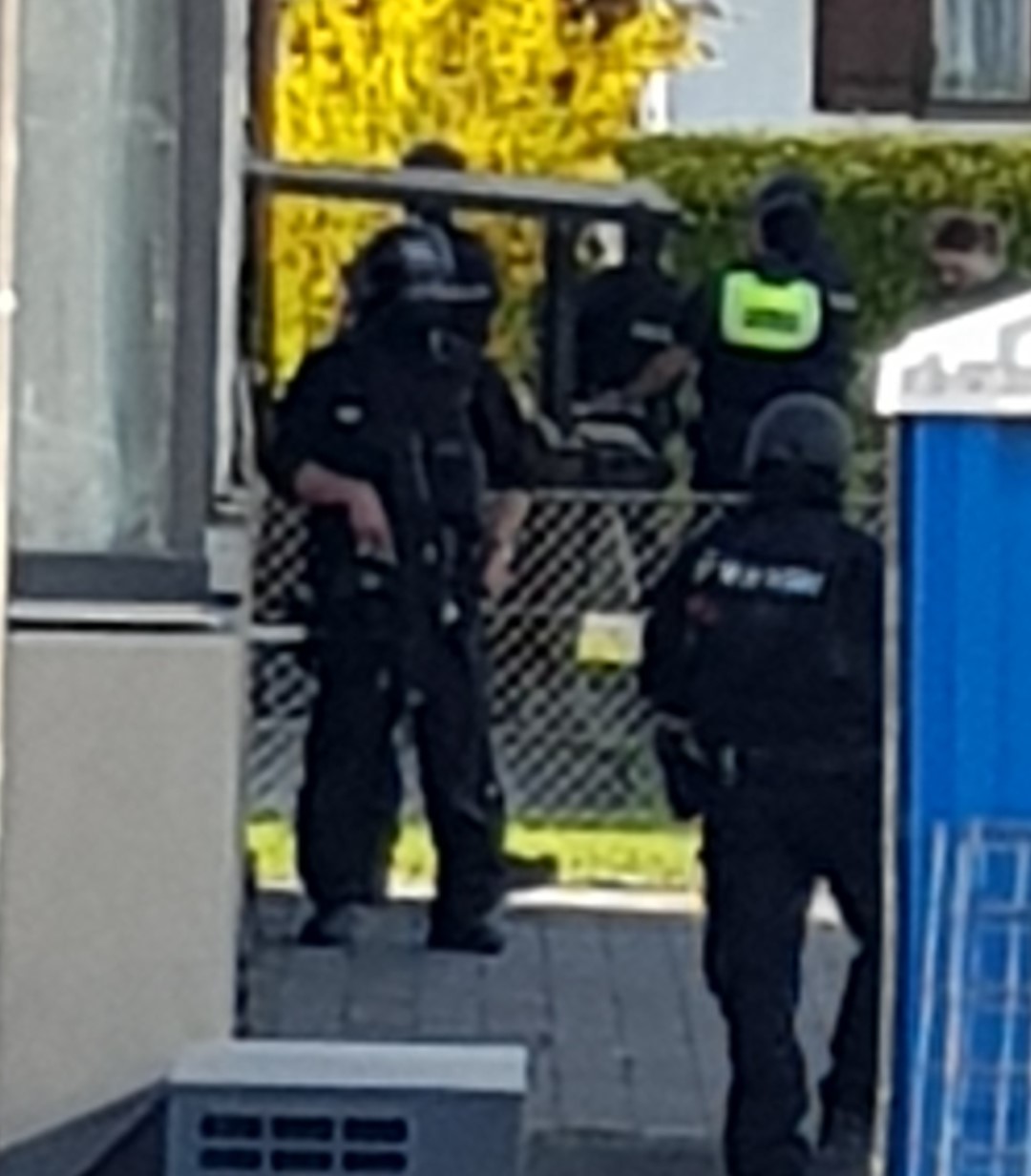 Update 19.30 Uhr: Polizeieinsatz läuft noch. Nach Information eines Anwohners wurde die Polizeipräsenz sogar noch mal weiter aufgestockt.