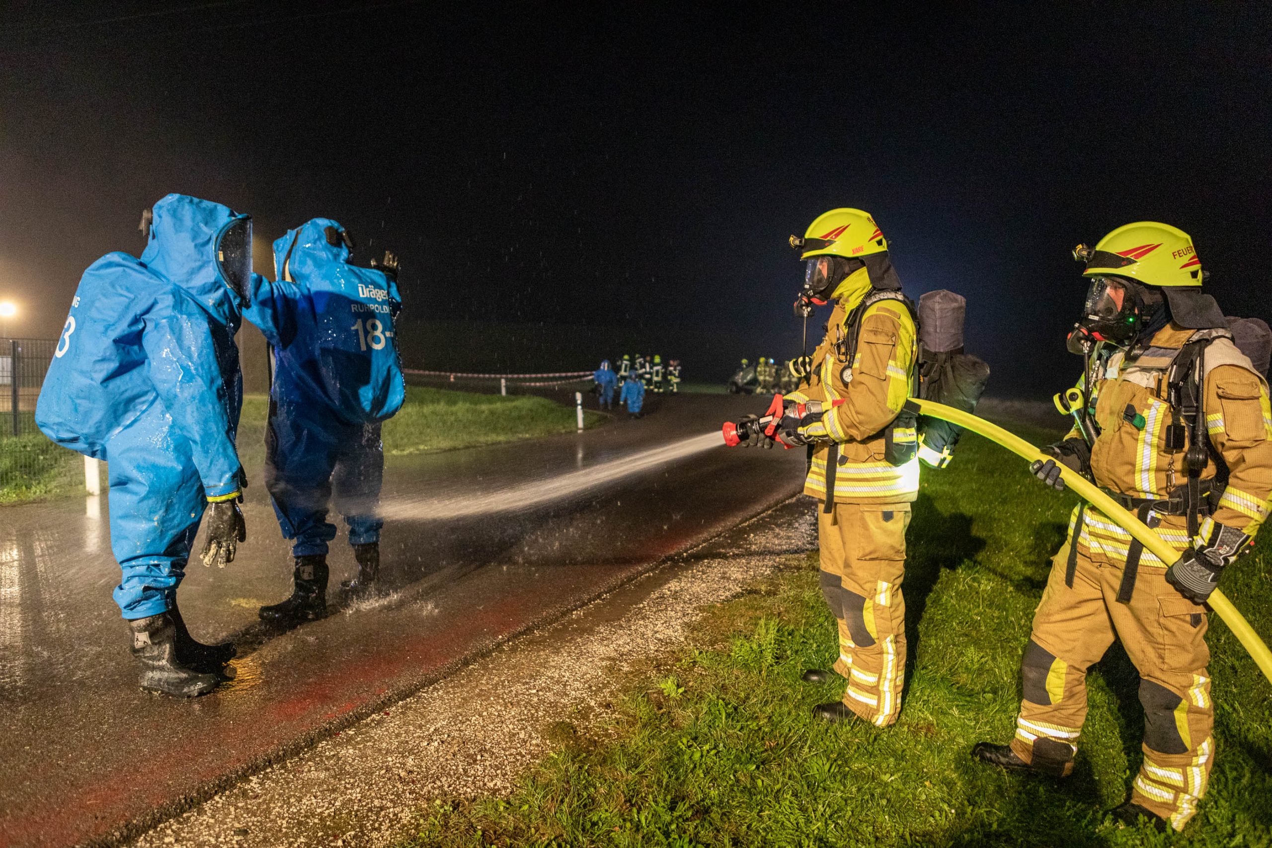 Im Gefahrgutbereich wurde ein Riss im Tank simuliert, aus dem kontinuierlich Flüssigkeit austrat. Neben dem Abdichten der Leckage kamen Chemikalienschutzanzüge zum Einsatz, zudem wurde eine Dekontaminationsstelle eingerichtet. „Gefahrguteinsätze sind für die Feuerwehren häufig sehr komplexe Einsatzlagen, die neben umfangreichem taktischem Wissen auch eine material- und personalintensive Herangehensweise erfordern“, erklärte Kink.
