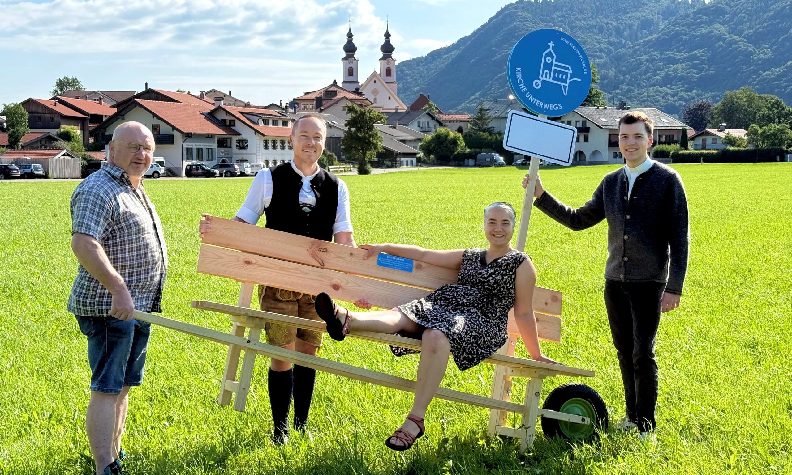 Aschau / Landkreis Rosenheim – Aschau im Chiemgau macht seinem Ruf als Bankerldorf wieder alle Ehre: Ab sofort ergänzt eine weitere Sitzgelegenheit die vielfältige Bankerlparade des Ortes – eine Bank zum Rollen schön. Was auf den ersten Blick wie ein pfiffiger Hingucker wirkt, hat einen tieferen Sinn: Die sogenannte Seelsorgebank ist ein mobiles Angebot vom Pfarrverband Oberes Priental und lädt zu Gesprächen, Begegnungen und spontanen Momenten der Seelsorge ein – mitten im Ort, draußen, unter Menschen.