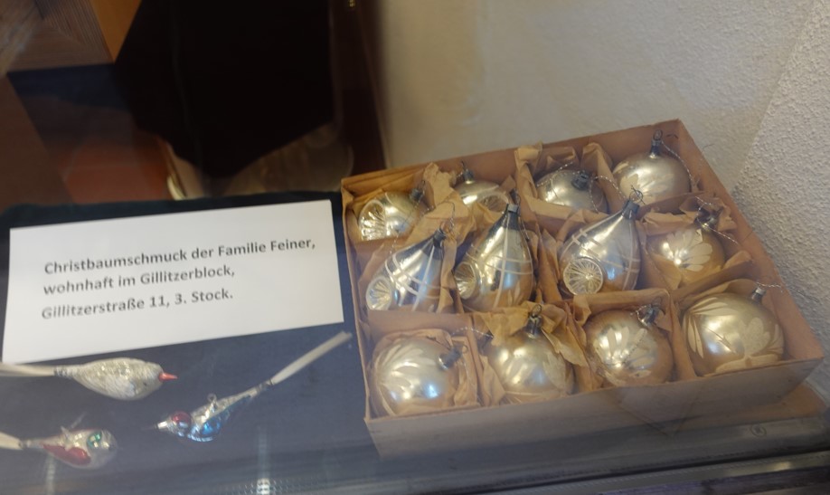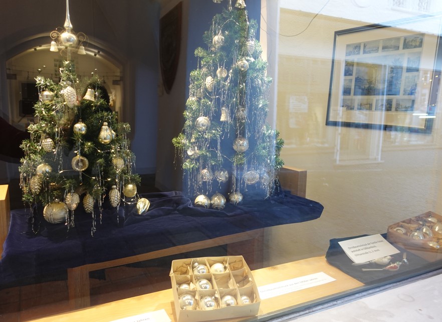 Rosenheim – Der im Schaufenster im Mittertor ausgestellte Christbaumschmuck stammt aus verschiedenen Haushalten des Gillitzerblock, darunter der Familie Feiner und der Familie Schauer. Zum Einsatz kamen die Glaskugeln und filigranen Glasvögelchen in den 1950er Jahren. Zu dieser Zeit glitzert es an den Bäumen besonders schön – nicht zuletzt auch durch das Lametta, das in der Zeit um 1880 herum enstand und in den 1950er Jahren seine Hoch-Zeit erlebte. Silber war auch als Farbe bei den Kugeln zu dieser Zeit sehr beliebt.