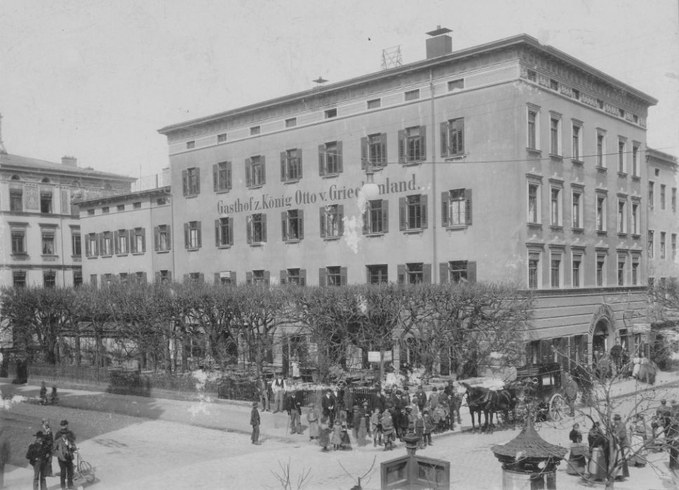 In Fokus dieser Aufnahme ist das Hotel „Zum König Otto von Griechenland“ mit seinem Biergarten. Seinen Namen hatte die Gastwirtschaft, laut Auskunft des Rosenheimer Stadtarchivs, von Otto, dem jüngeren Sohn von König Ludwig I. von Bayern, der auf seiner Reise nach Athen dort abstieg.