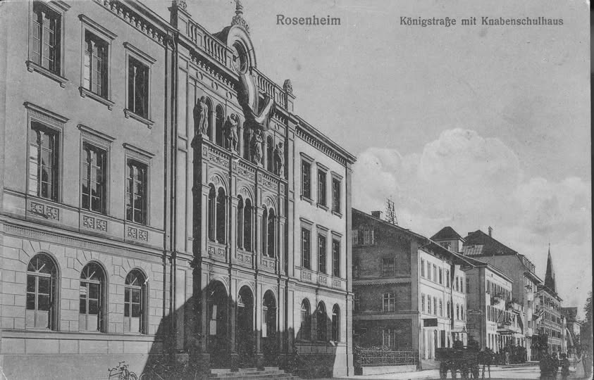 Rosenheim – Unsere heutige Zeitreise führt zurück ins Jahr 1915. Auf der historischen Aufnahme ist die ehemalige Königschule in Rosenheim zu sehen – ein Gebäude mit Geschichte. Errichtet in den Jahren 1866 und 1867, kurz nach der Erhebung Rosenheims zur Stadt, sollte es die damals akute Raumnot im Schulwesen lindern.