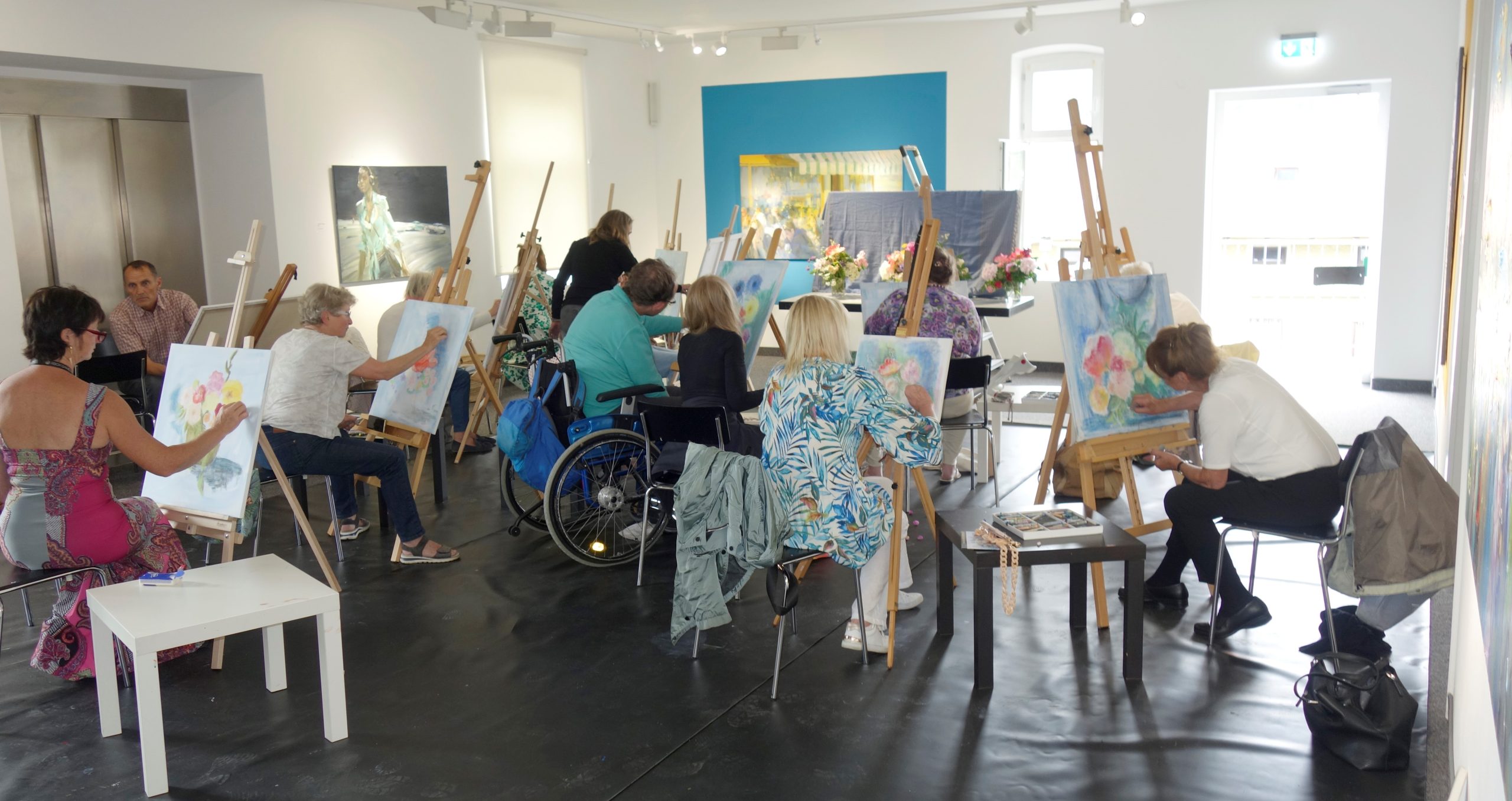 Zacharova, bekannt für ihre farbgewaltigen, sinnlichen Stadt- und Menschenbilder, die das urbane Leben mit technischer Präzision und emotionaler Tiefe einfangen, begleitete die Teilnehmer zusammen mit Kuratorin Ingrid Fricke durch den kreativen Prozess. Im Zentrum stand die künstlerische Auseinandersetzung mit einem Blumenmotiv – ein Sujet, das unter der Anleitung der Künstlerin zu einer eindrucksvollen Spielwiese aus Licht, Farbe und individueller Ausdruckskraft wurde.