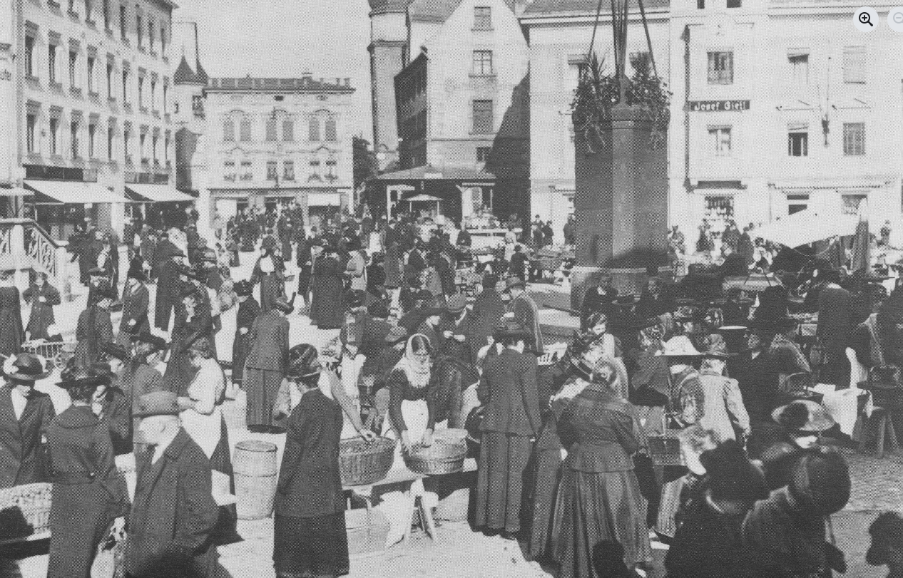 Das Foto entstand zu einer Zeit, in der es noch keine Supermärkte und Discounter gab, dementsprechend viel los war auf dem Markt.