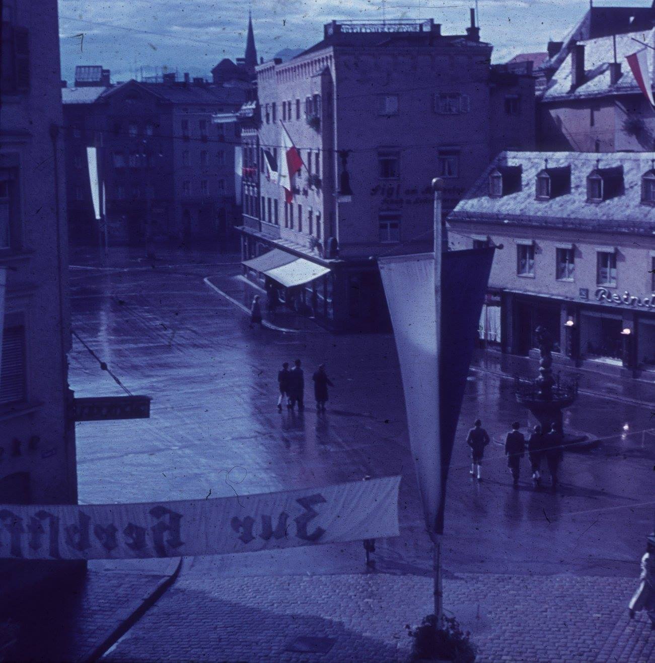 Angesichts der Fahnen und dem Banner muss unser heutiger Fotooldie wohl während der Herbstfestzeit entstanden sein – vielleicht am frühen Morgen, weil es doch sehr ruhig erscheint – und regennass obendrein. Erkennbar ist das Schuhhaus Reindl, dass es auch heute noch gibt.