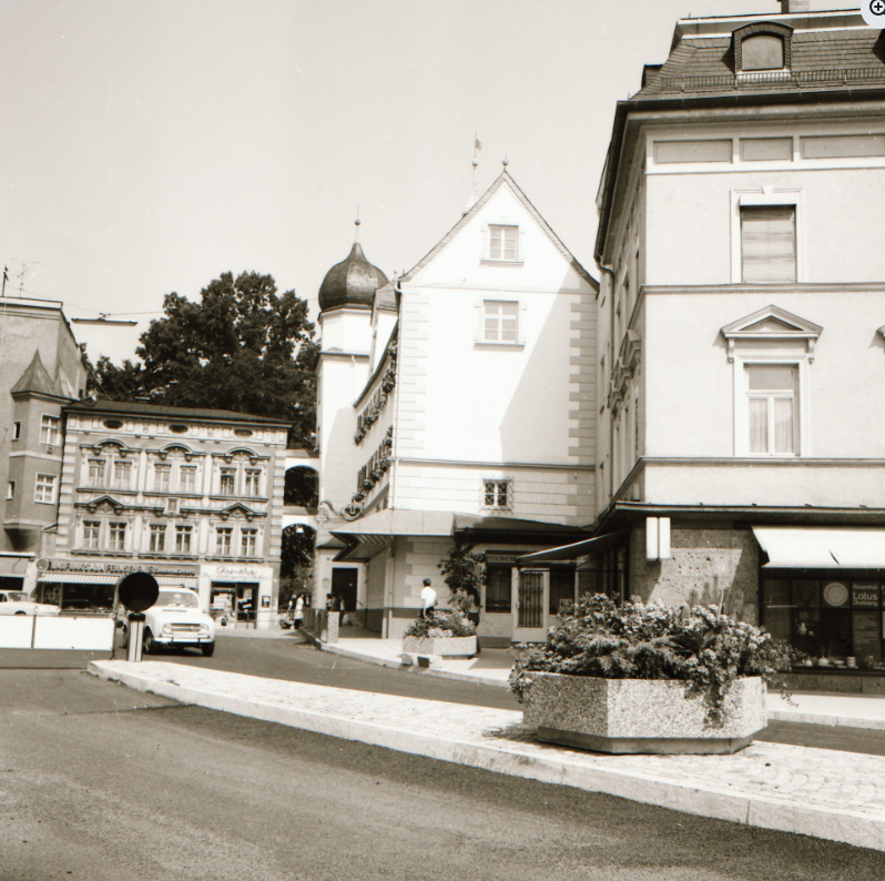 Der Blick geht in Richtung Mittertor. Autos waren zu dieser Zeit in diesem Bereich noch eine Selbstverständlichkeit. Dekorative Pflanzenkübel gab es aber auch damals schon.