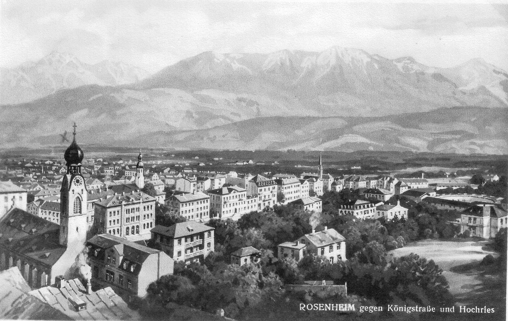 Im Vordergrund zu sehen ist die Kirche St. Nikolaus, dahinter die Königstraße. Der Blick geht Richtung Hochries. Das Bild wurde aber wohl nachbearbeitet.