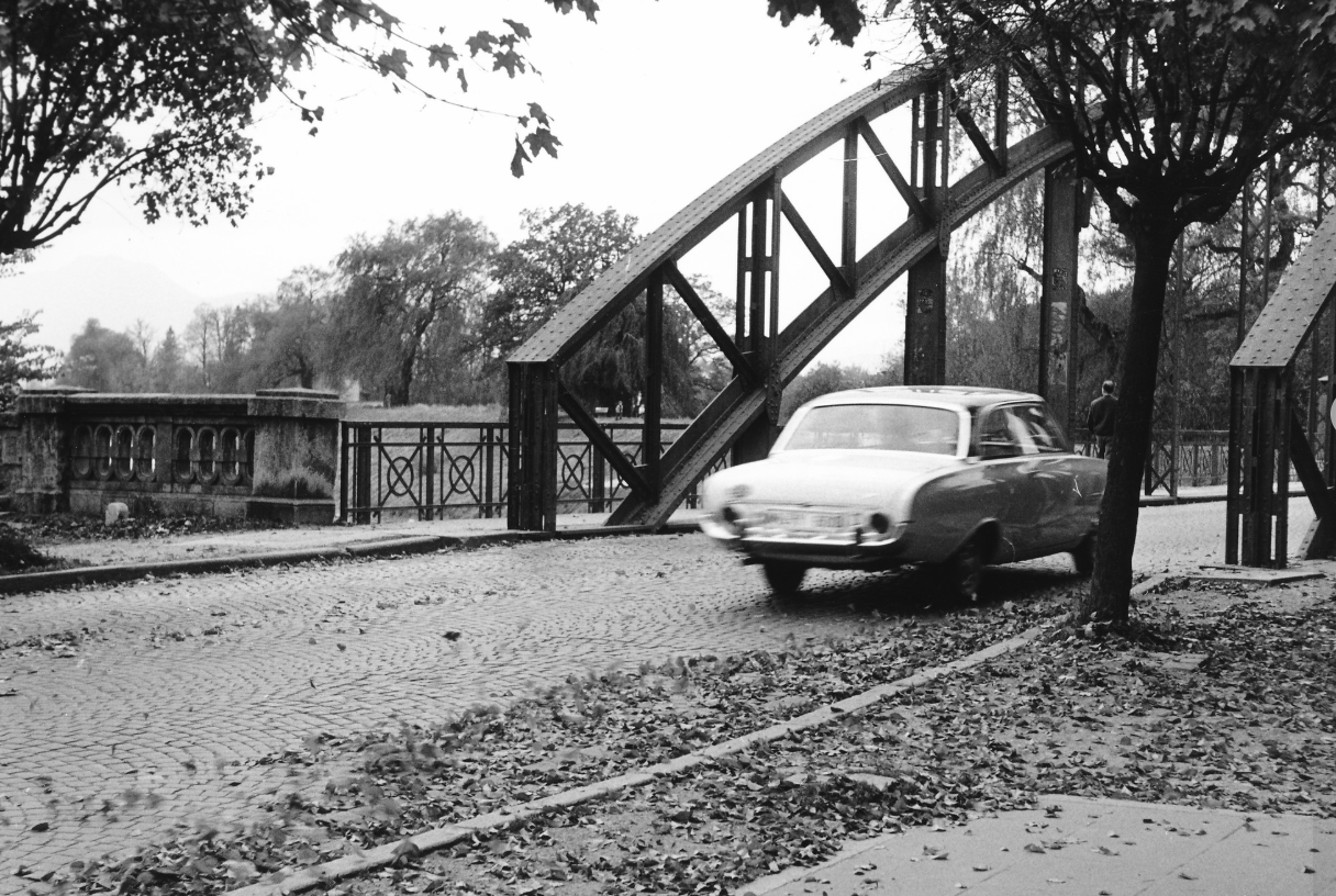 Vor dem Bau einer eisernen Bogenbrücke führte noch eine hölzerne Brücke an dieser Stelle über die Mangfall. Aber auch die eiserne Bogenbrücke auf unserem Fotooldie ist Geschichte. Ein Hingucker auf dieser Aufnahme ist natürlich auch der alte Ford.