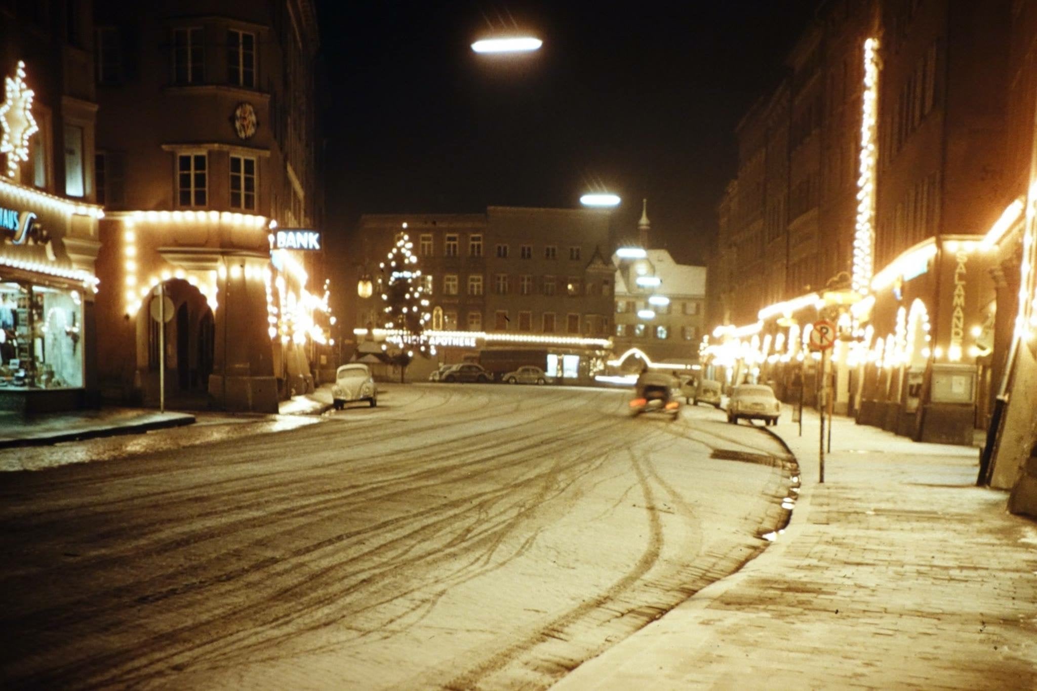 Die Fußgängerzone wurde erst im Jahr 1984 eröffnet. Die Jahre davor war dieser Bereich im Herzen der Stadt noch sehr verkehrsreich. Der Rosenheimer Christkindlmarkt wurde ebenfalls im Jahr 1984 das erste Mal veranstaltet. Darum wirkt unser heutiger Fotooldie noch etwas leer. Aber immerhin gab es in den 1970er Jahren bereits einen Christbaum und eine festliche Beleuchtung.