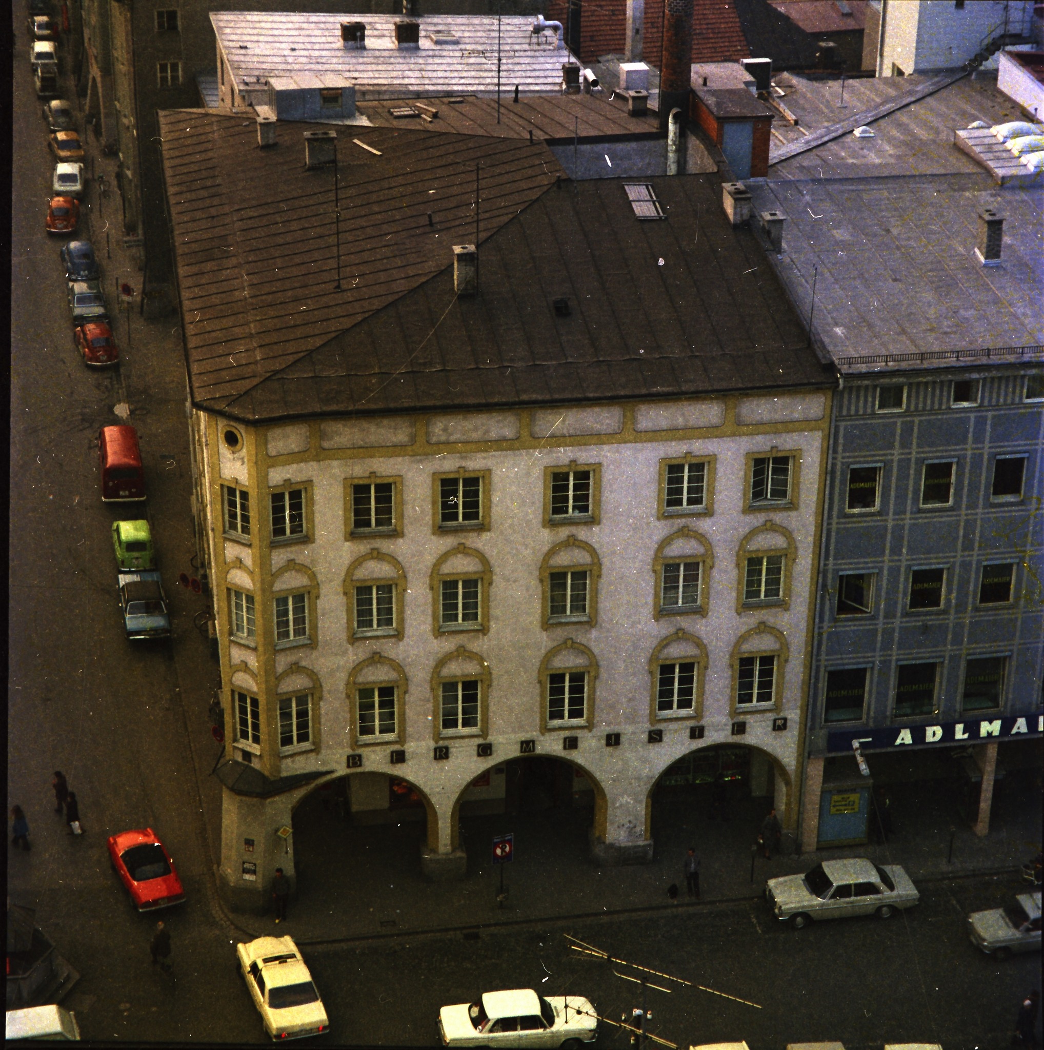 Von oben fotografiert eröffnet sich eine neue Perspektive auf die gute Stube der Stadt. Das Männerbekleidungshaus Adlmaier ist seit Januar diesen Jahres Geschichte. Stattdessen findet man in dem Gebäude nun Mode Heppel. In dem Gebäude links daneben ist nach wie vor die Bäckerei Bergmeister zu finden.