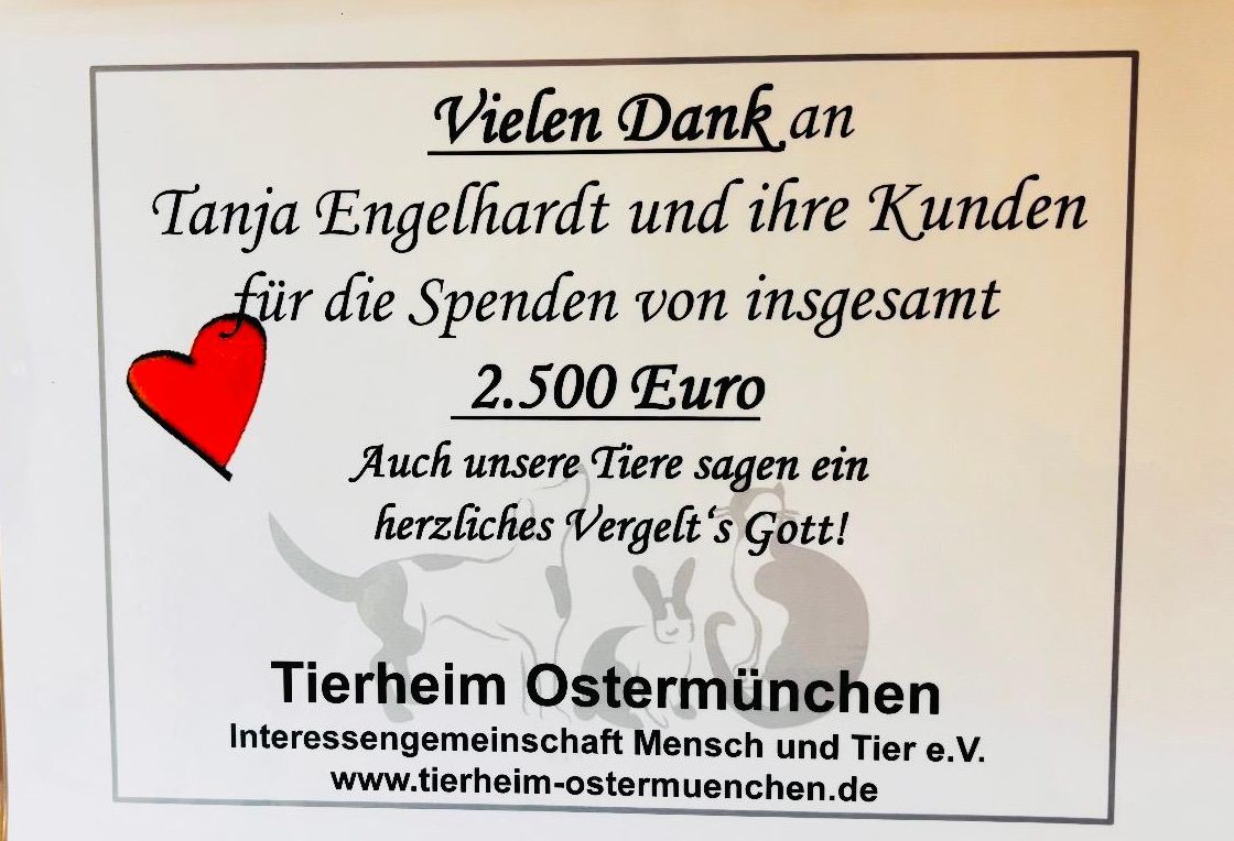 Die Weihnachtstombola im Salon von Friseurmeisterin Tanja Engelhardt war ein voller Erfolg und ein Beispiel für gelebte Nächstenliebe – diesmal zugunsten der Tiere. Über mehrere Wochen hinweg beteiligten sich zahlreiche Kunden sowie Besucher aus der Region an der liebevoll organisierten Aktion. Am Ende konnte am Sonntag, 11. Januar, eine Spendensumme von 2.500 Euro an das Tierheim Ostermünchen übergeben werden.