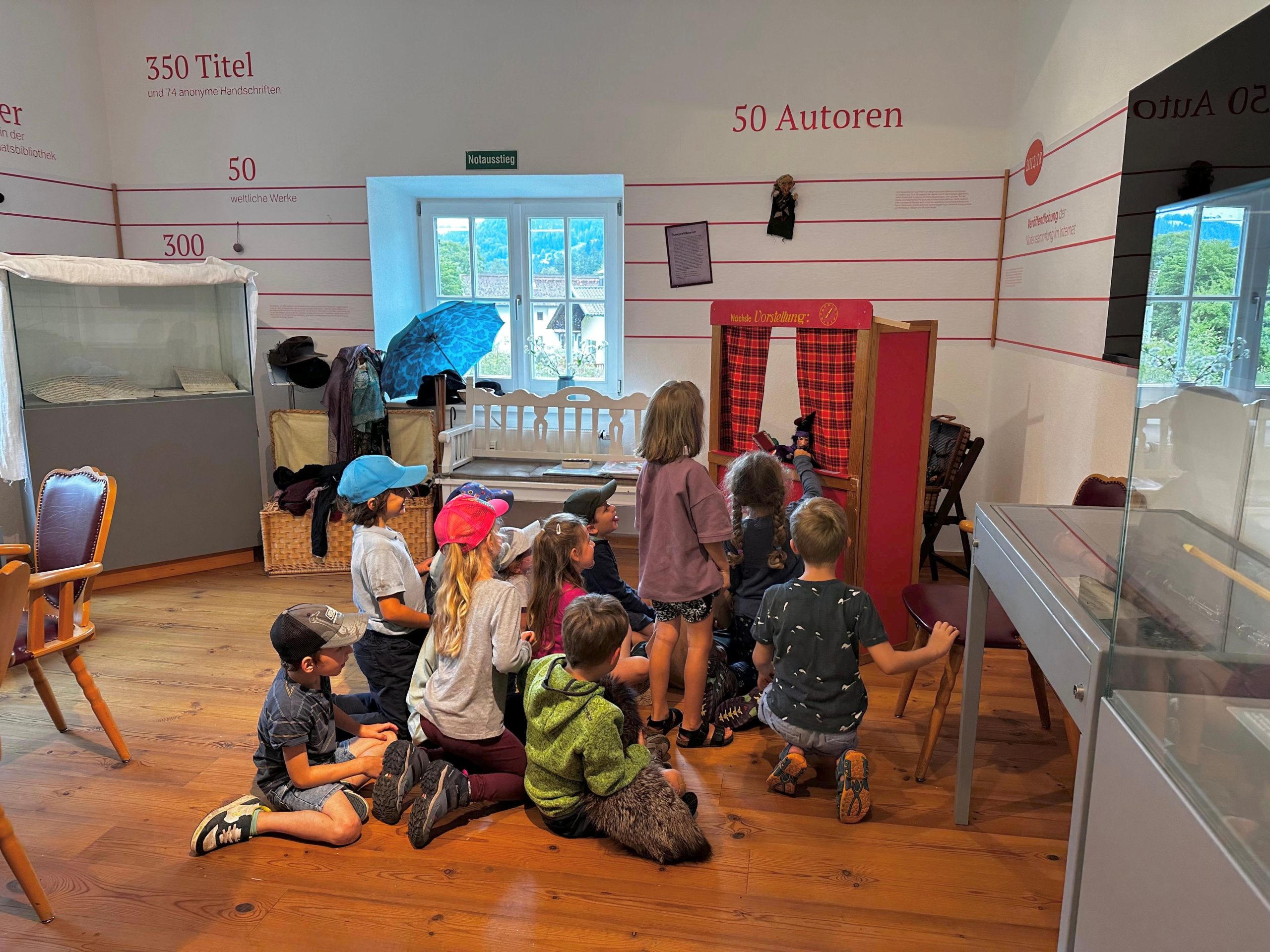 Der Geschichte des Müllner Peter und dem Leben hier früher im Priental lauschten die Kinder ebenso aufmerksam, wie der Geschichte des Spielens in Bezug auf die Sonderausstellung im Museum „ Spui ma zam“: von römischen Spielzeug, zu geschnitzten Holztieren aus dem Tal, von Puppenküchen zum Spielzeug der Familie von Cramer Klett, dann waren sie nicht mehr zu halten.