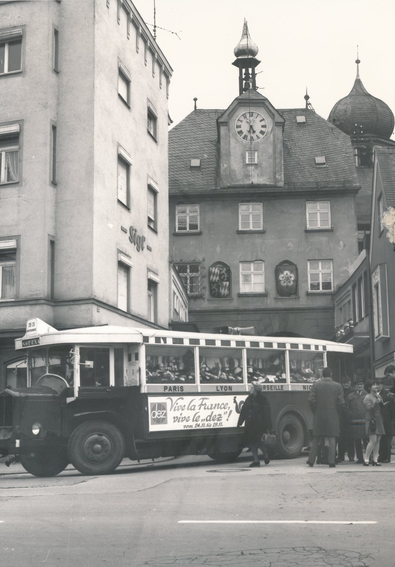 Der Bus, der sich da vor dem Mittertor in Stellung gebracht hat, macht Werbung für das Einkaufszentrum DEZ am Aicherpark – heute Kaufland.