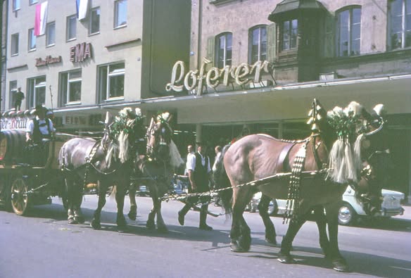 Unschwer zu erkennen ist, wann genau unsere heutige Archivaufnahme in der Münchener Straße gegenüber dem Salingarten entstanden ist: natürlich beim Herbstfest-Einzug. Fast noch interessanter ist aber der Blick auf die beiden Geschäfte hinter dem Brauerei-Gespann: Ema und Loferer – beide mittlerweile Geschichte.