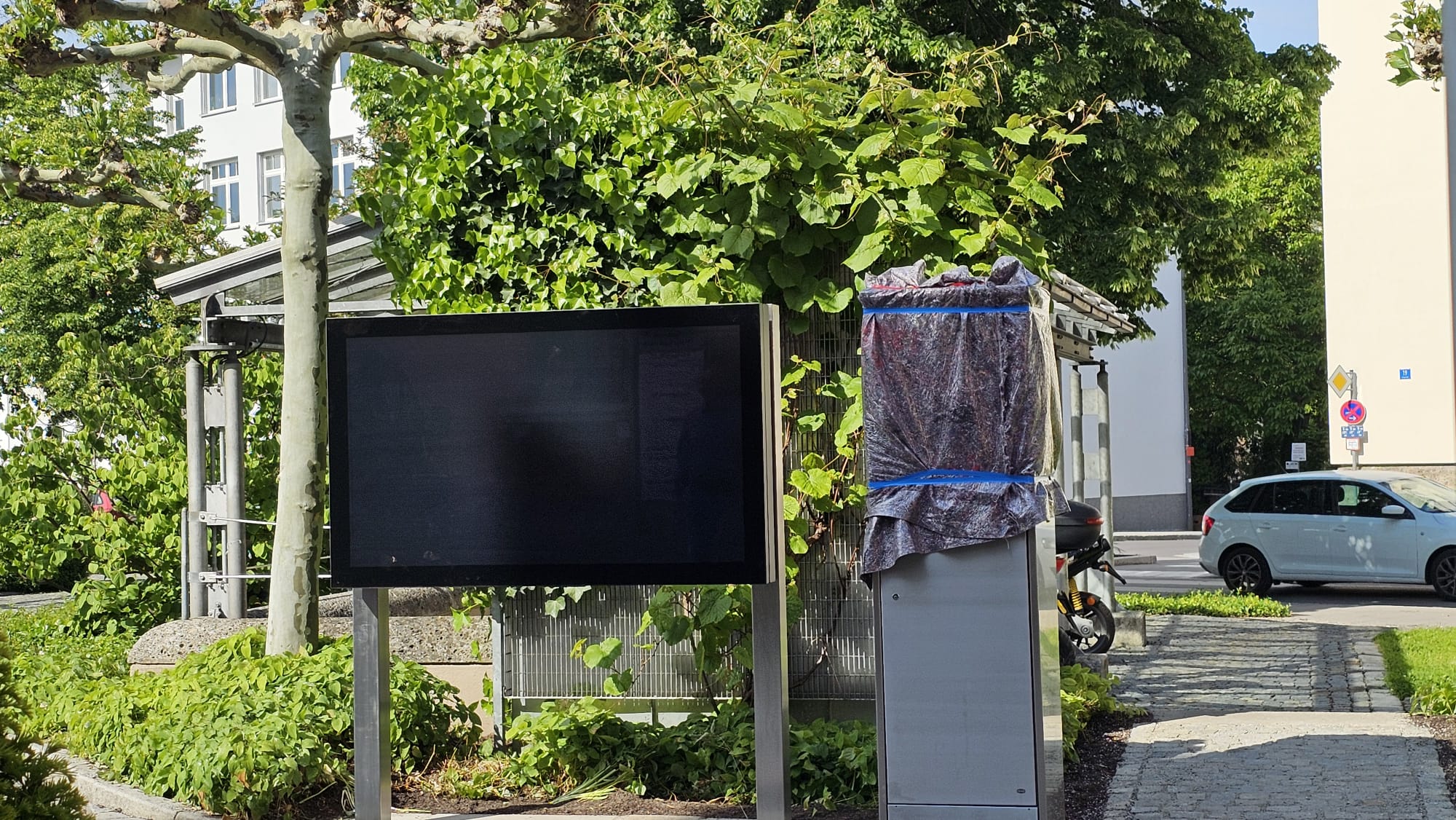 Die neue Anschlagtafel steht auf dem Rathaus-Vorplatz. Vorteil: sie ist damit auch außerhalb der Öffnungszeiten für jedermann frei zugänglich. Zukünftig wird man darauf beispielsweise ins Amtsblatt einsehen können. Auch für die öffentliche Auslegung von Bebauungsplänen soll die digitale Anschlagtafel genutzt werden.