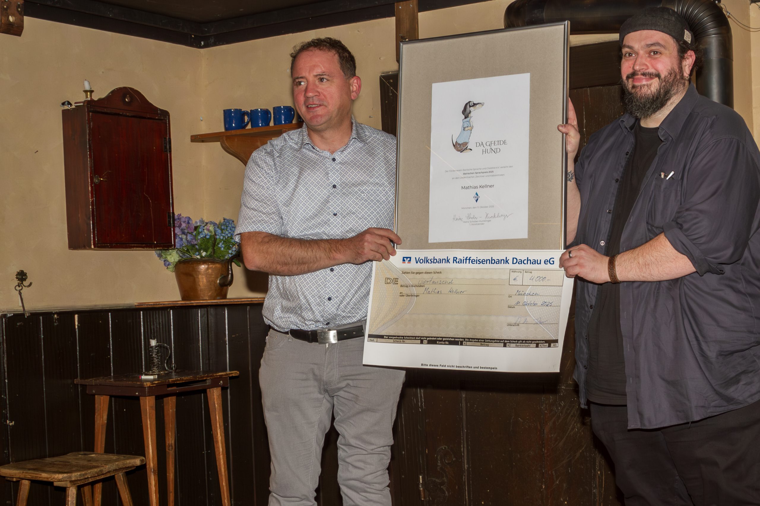 Im Rahmen der Jahreshauptversammlung des FBSD überreichte der 1. Vorsitzende Heinz Schober-Hunklinger am Samstag (11.10.2025) den mit 4.000 Euro dotierten Sprachpreis an Mathias Kellner. In der vollbesetzten Iberl Bühne in München feierten Vorstand und Mitglieder des Vereins den ersten Preisträger der neuen Auszeichnung.