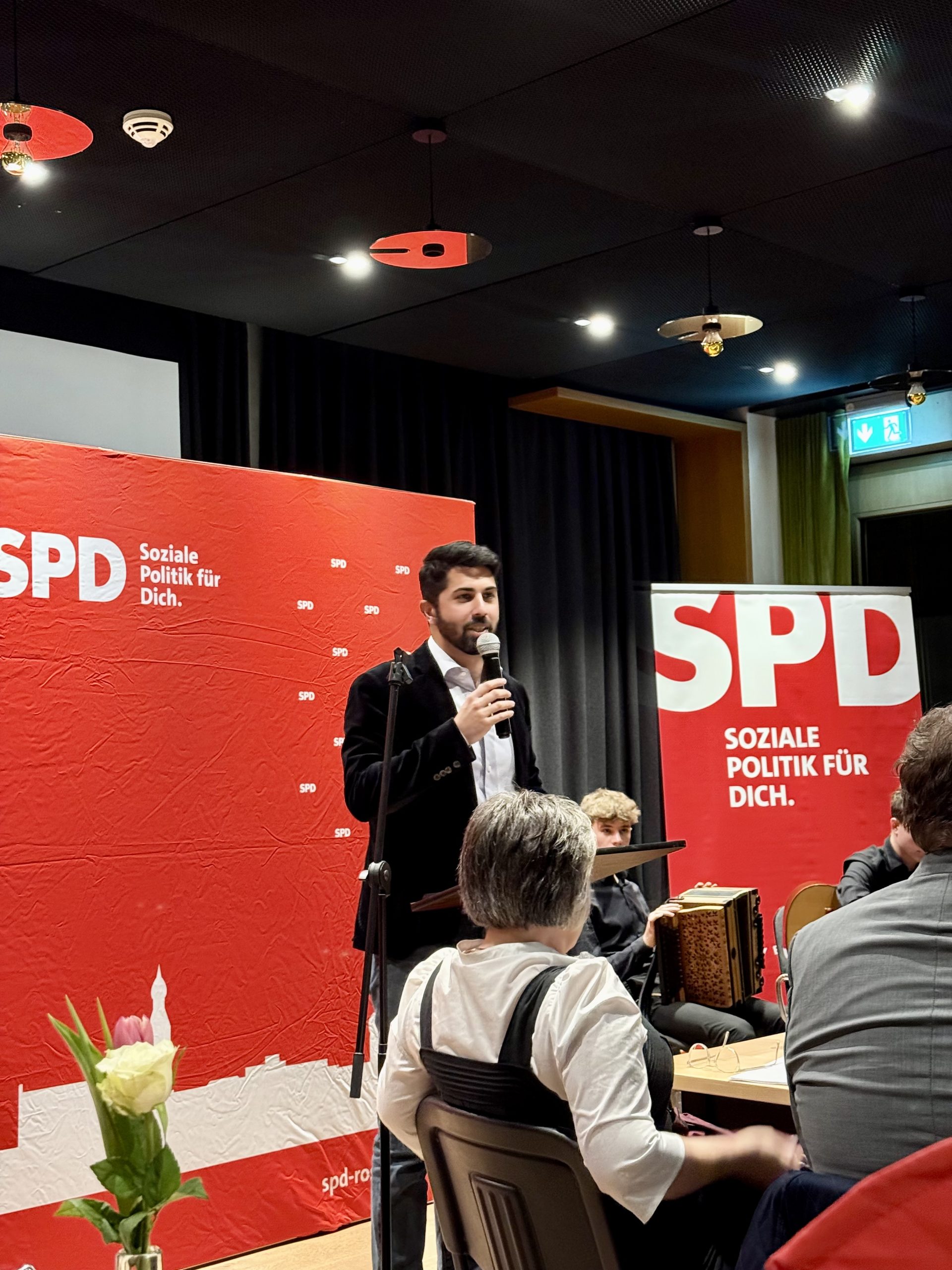 Abuzar Erdogan, Vorsitzender der SPD Rosenheim machte den Auftakt bei den Reden. Fotos. SPD Rosenheim