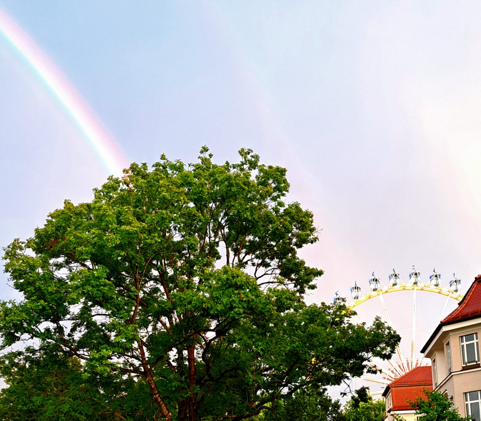 Der natürliche Farbbogen wirkte fast wie eine zusätzliche Attraktion des Volksfestes und tauchte nicht nur das Festgelände, sondern auch die Stadt in eine besondere Stimmung. Viele Menschen hielten den Moment spontan mit ihren Handykameras fest.